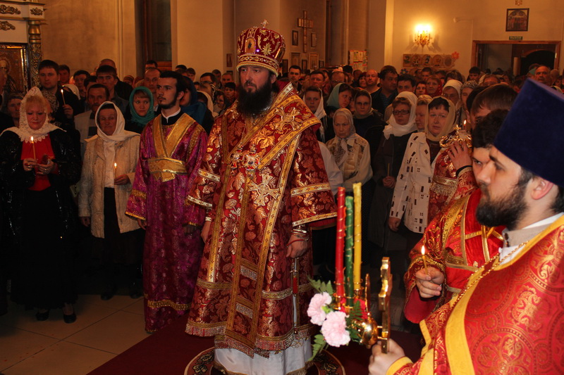 В притворе при затворенных дверях храма началась пасхальная утреня возгласом: «Слава Святей…». Преосвященнейший епископ Амфилохий, приняв от диакона кадило, совершил каждение, а священнослужители трижды пропели: «Христос воскресе из мертвых, смертию смерть поправ и сущим во гробех живот даровав»…