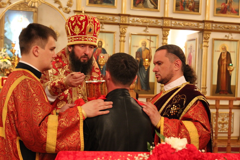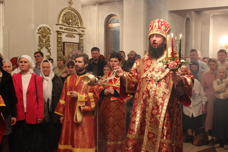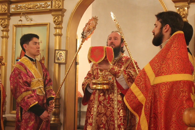 После пасхальной утрени Преосвященнейшим Амфилохием, епископом Усть-Каменогорским и Семипалатинским, в сослужении духовенства была совершена Божественная Литургия святителя Иоанна Златоуста.