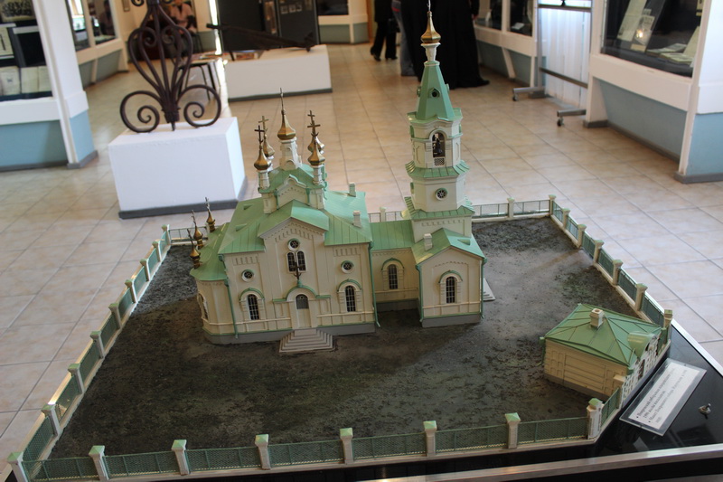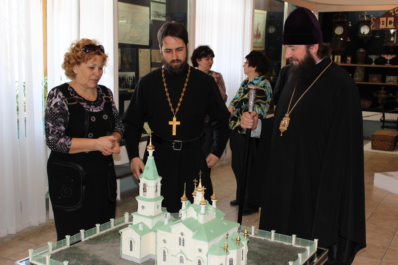 В три часа пополудни владыка и гости посетили Восточно-Казахстанский Областной Историко-Краеведческий музей, где в представленной экспозиции ознакомились с прижизненными фотографиями протоиерея Александра Дагаева, предметами быта дореволюционного Усть-Каменогорска, увидели макет и фото разрушенного Покровского собора.
