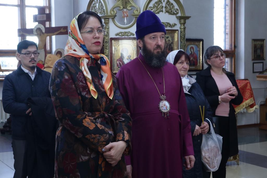 Высокую гостью встречали Преосвященнейший епископ Амфилохий и секретарь епархии диакон Илия Кван. В Андреевском соборе Асем Бековна пожелала благополучие и процветание казахстанскому народу.