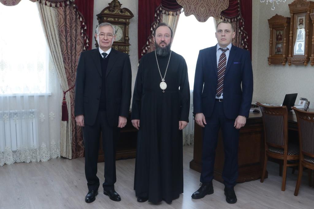 Дипломата встречали Управляющий епархией Преосвященнейший епископ Амфилохий и секретарь епархии диакон Илия Кван. Михаил Юрьевич ознакомился с работой епархиального управления и посетил Церковно-археологический кабинет, расположенный в здании Духовно-административного корпуса.