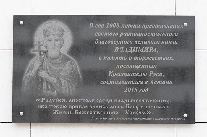 На доске выгравирован образ равноапостольного князя Владимира и запечатлена цитата из знаменитого памятника древнерусской литературы «Слова о Законе и Благодати» митрополита Киевского Илариона, прославляющего Крестителя Руси: «Радуйся, апостоле среди владычествующих, ибо тобою приблизились мы к Богу и познали Жизнь Божественную – Христа».