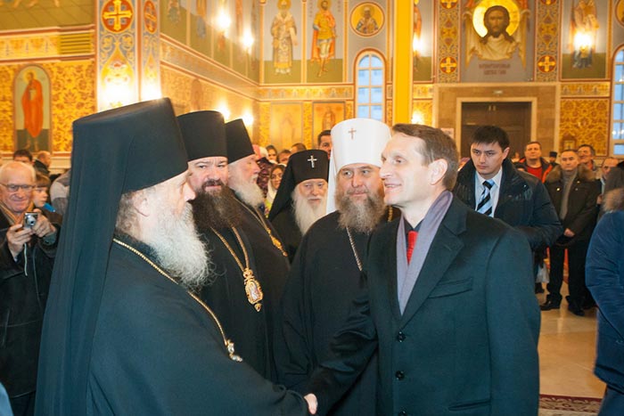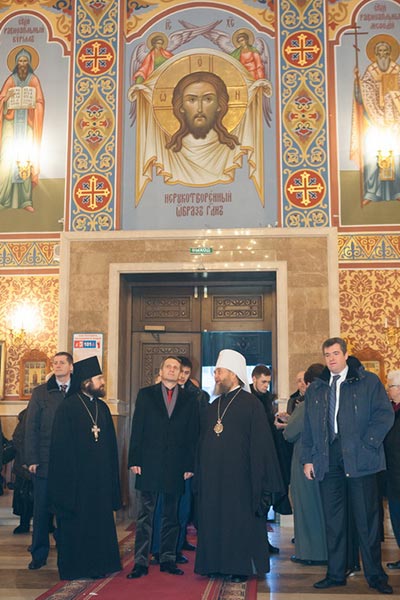 Владыка митрополит рассказал С.Е. Нарышкину о строительстве и благоукрашении храма, о росписи стен и сводов, выполненной артелью мастеров-изографов из города Палех (Россия, Ивановская область) под руководством члена Союза художников России В.К. Курилова, и создании резного позолоченного иконостаса, изготовленного резчиками художественно-производственной мастерской имени Феодора Стратилата в лучших русских традициях XVII века, и украшенного иконами, написанными Заслуженным художником Российской Федерации С.Н. Соколовым.
