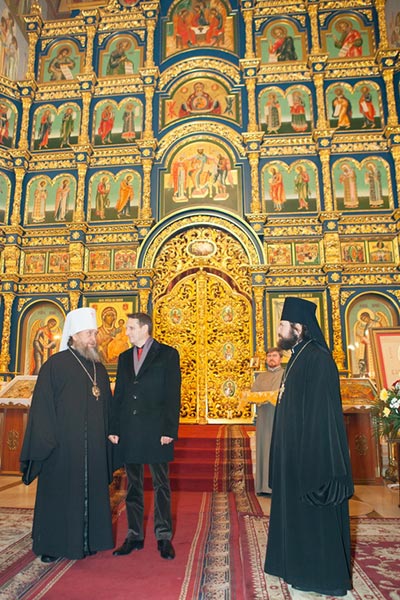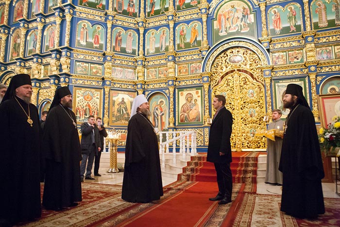 В Успенском соборе Сергея Евгеньевича и сопровождавших его лиц приветствовал Глава Митрополичьего округа Русской Православной Церкви в Республике Казахстан митрополит Астанайский и Казахстанский Александр.
