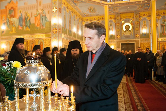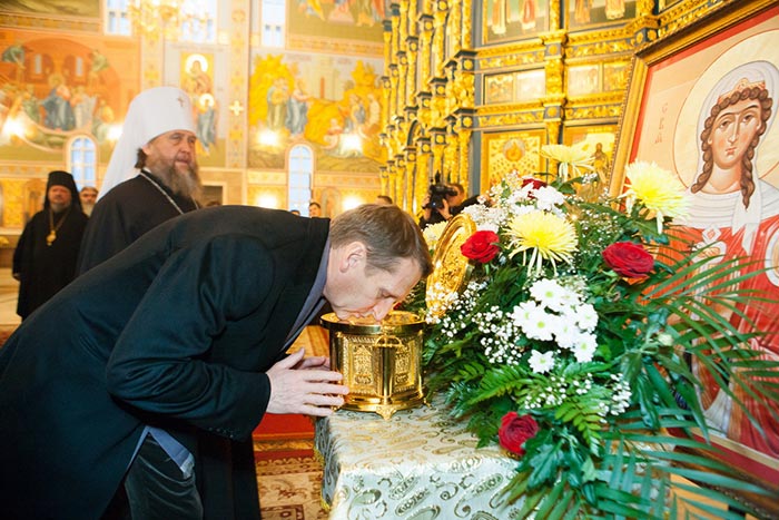 Перед великой святыней – ковчегом с частью мощей великомученицы Варвары, доставленным для молитвенного поклонения верующих в Астану из Свято-Никольского собора Алма-Аты, - Спикер Госдумы Российской Федерации возжег свечу.
