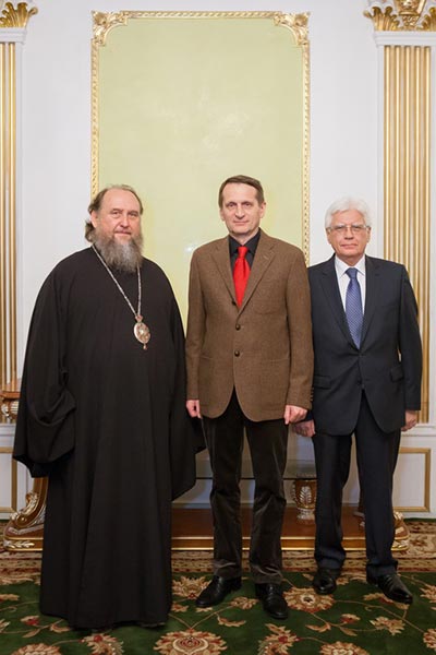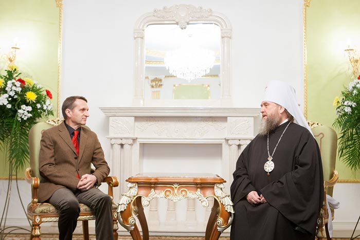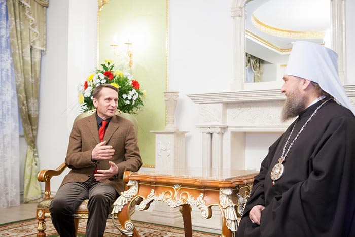Спикер Госдумы Российской Федерации проинформировал митрополита Александра о цели своего визита в Астану - участии в работе международной конференции «Президент. Парламент. Интеграция», которая проводится по инициативе Мажилиса Парламента Республики Казахстан.