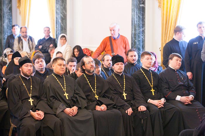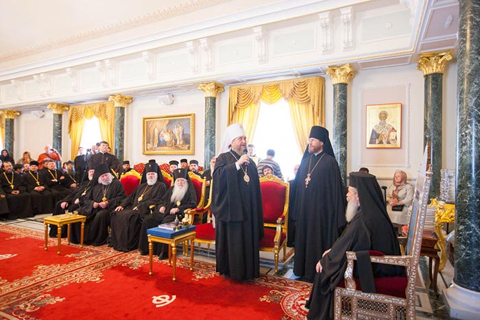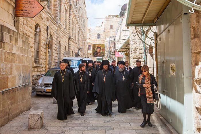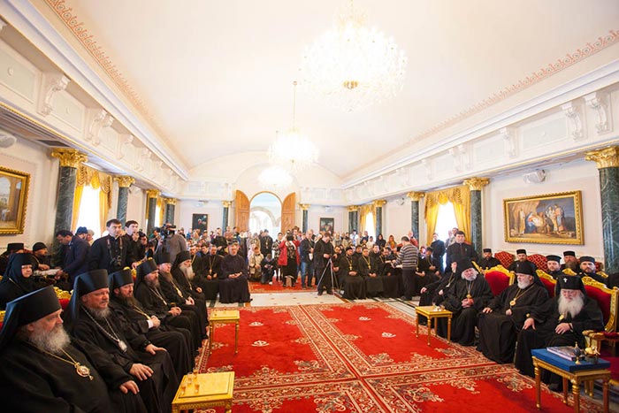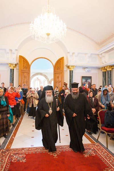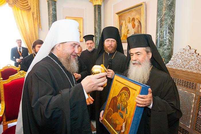 Обращаясь к митрополиту Александру и гостям, Блаженнейший Патриарх Феофил отметил: «Посещение Святой Земли — это великое благословение как самим паломникам, так и проживающим здесь людям. Поскольку положение христиан на Ближнем Востоке очень тяжелое. Мы видим, что христианство переживает сейчас весьма непростое время. Но всегда современными остаются слова Спасителя о том, что врата ада не одолеют Церковь. Мы живем, укрепляемые светом Воскресения Господа Иисуса Христа, и в надежде личного воскресения и будущей блаженной жизни. Это не теория, не умозаключение, а практическая жизнь. Мы, члены Святогробского Братства, являемся охранителями святых мест, связанных с жизнью Христа Распятого и Воскресшего. И именно этот факт поддерживает и укрепляет всех нас для несения с благодатью нашего послушания. Мы постоянно возносим молитвы о благополучии всех христиан, живущих на планете. И прежде всего — о всех Православных Церквах и их единстве. Для нас единство означает не уменьшение своеобразия, но, напротив, его увеличение. Именно единство в многообразии является силой Церкви. Мы составляем единое Тело Спасителя нашего Господа Иисуса Христа. Чтобы сохранить единство, требуется борьба, поскольку мироправитель тьмы века сего старается его разрушить».