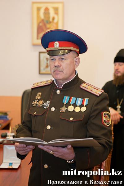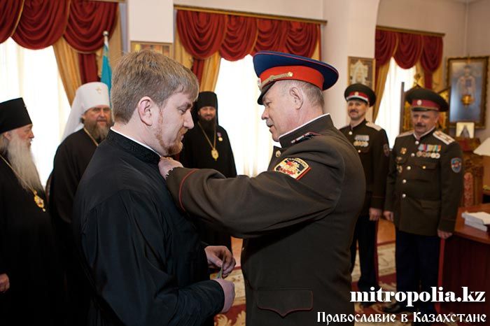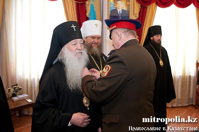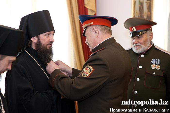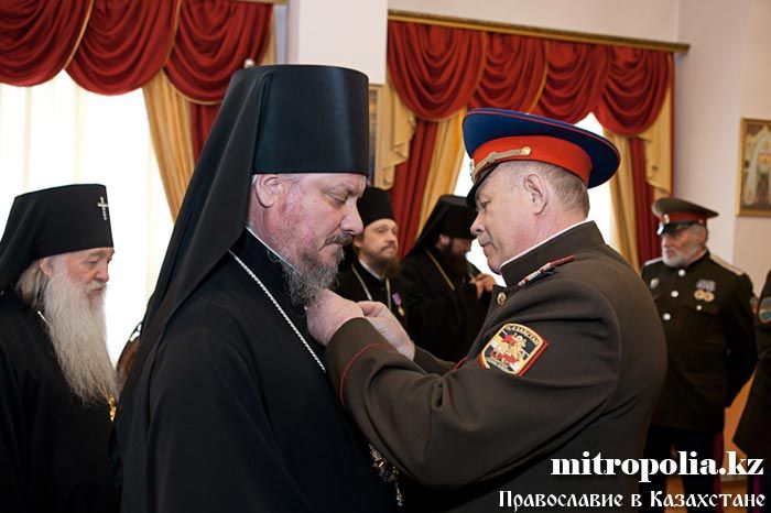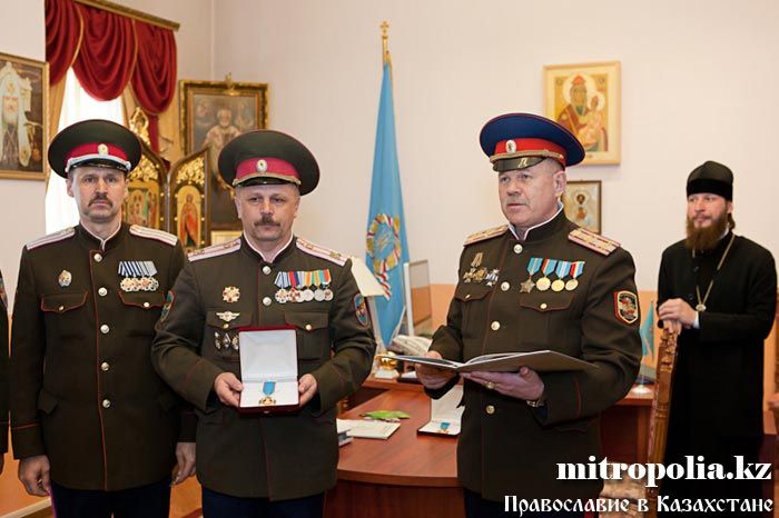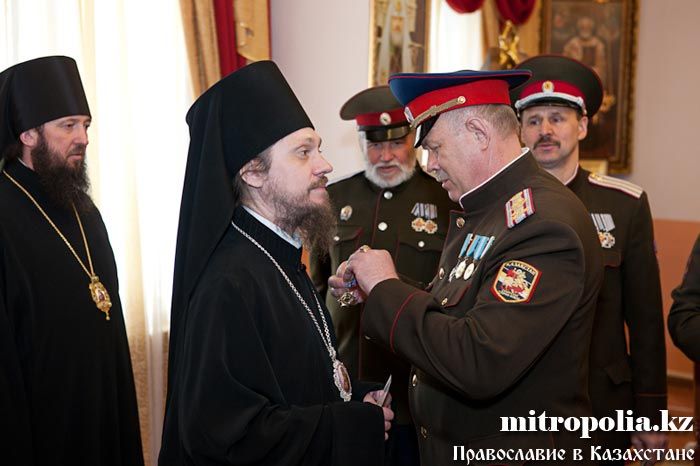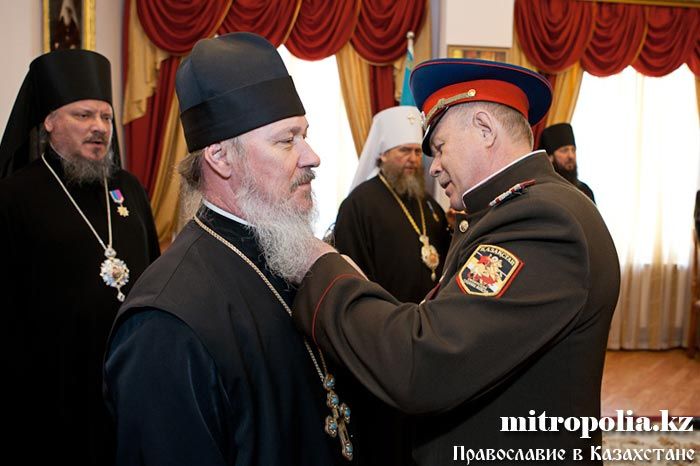Епископ Геннадий, епископ Севастиан, епископ Амфилохий, протоиерей Валерий Захаров и протодиакон Роман Головин за вклад в развитие церковно-общественных отношений и работу с казачеством награждены медалью Союза казачьих общественных объединений Казахстана - «Сарыбай-Бий Айдос-улы. 150-лет Победы под с. Узун-Агаш».