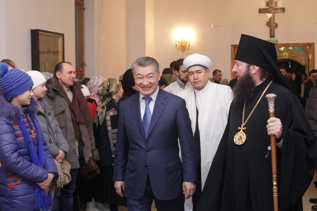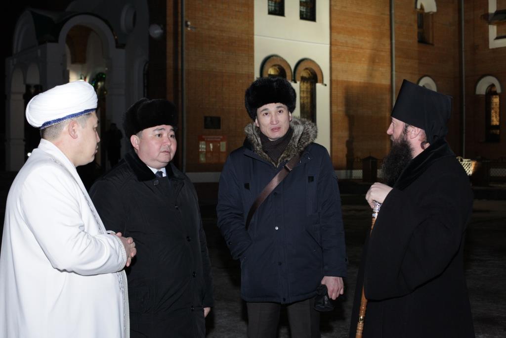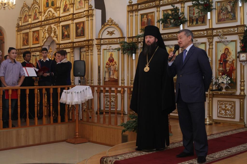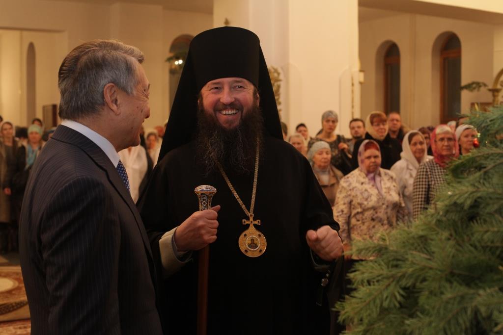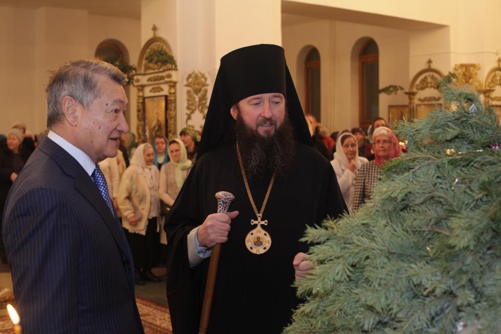 Высоких гостей встречал епископ Амфилохий, духовенство и многочисленные прихожане кафедрального собора. Д.К. Ахметов поздравил Владыку Амфилохия и всех православных христиан с великим праздником Рождества Христова. Глава области, в частности, отметил, что суверенный Казахстан за годы независимости стал образцом мирного сосуществования представителей различных этносов, религиозных конфессий и культур. Государственная власть, духовные лидеры, общественность Казахстана сообща трудятся над созданием сильного, динамичного, современного государства. Большое место в этом процессе занимает Православие. Православная Церковь помогает людям обрести веру и покой, укрепляя их на жизненном пути; она играет заметную роль в упрочении института семьи, материнства и детства, гармонизации межнациональных и межрелигиозных отношений, внося огромный вклад в развитие духовного единства, укрепления дружбы и межконфессионального согласия в стране.