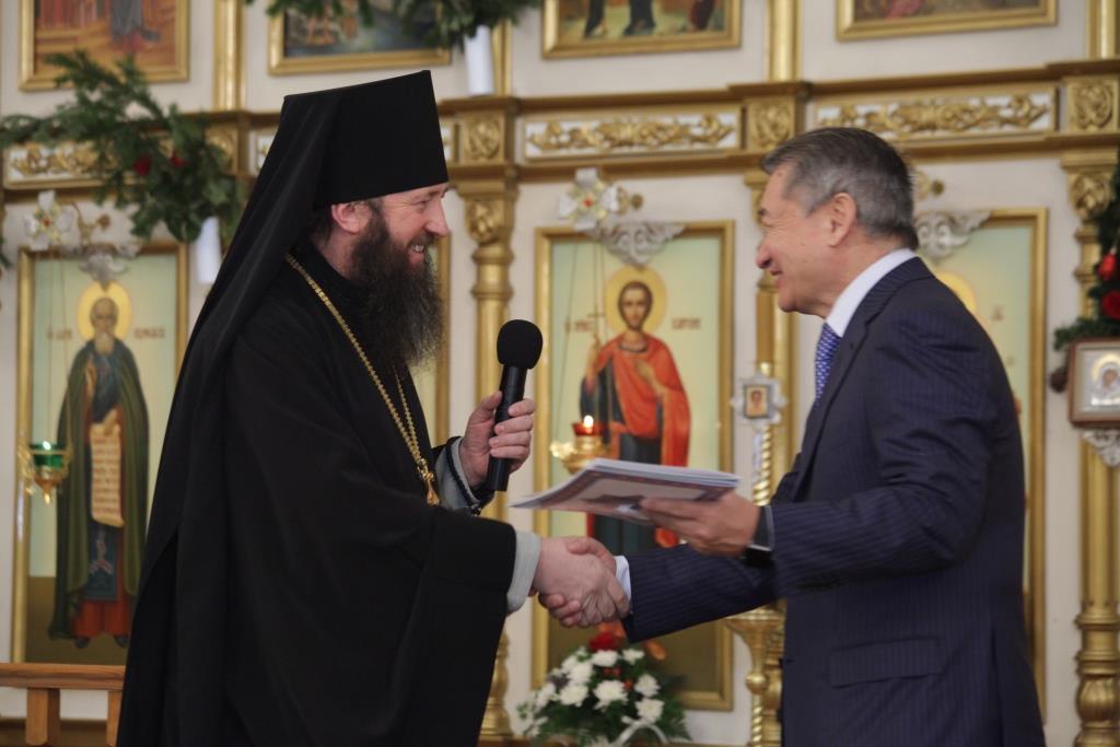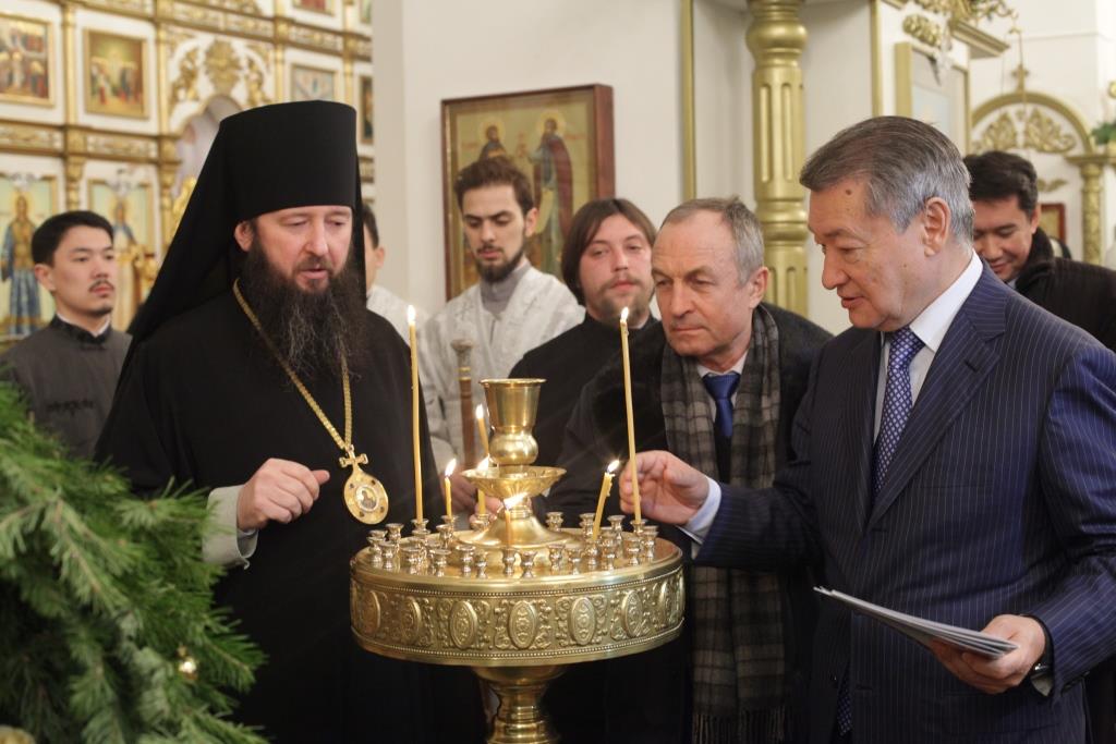 Епископ Амфилохий вручил руководителю области и сопровождавшим его лицам Рождественские послания Святейшего Патриарха Московского и всея Руси Кирилла и митрополита Астанайского и Казахстанского Александра. Высокие гости возжгли свечи за мир и процветание Казахстана.