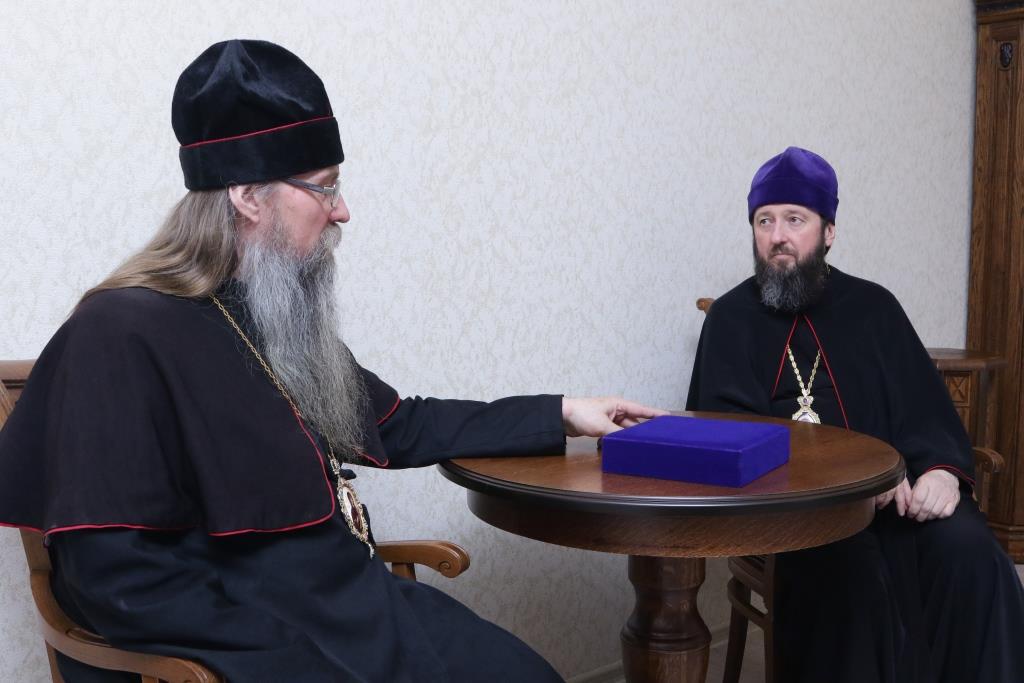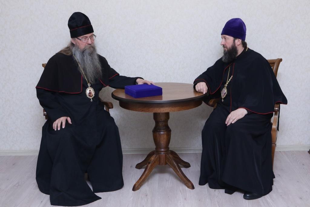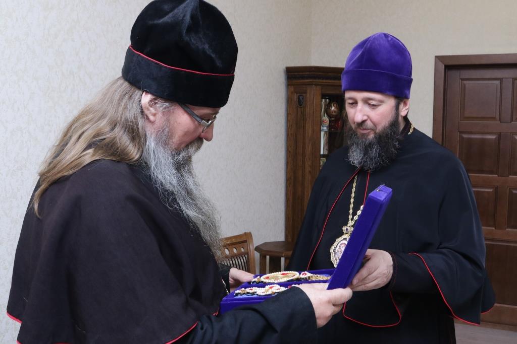 Затем состоялась беседа епископа Амфилохия и епископа Савы, в ходе которой иерархи рассказали друг другу о подготовке к празднованию Пасхи Христовой в православных и старообрядческих общинах Рудного Алтая. В завершение встречи епископ Амфилохий преподнес епископу Саве на молитвенную память крест и панагию.