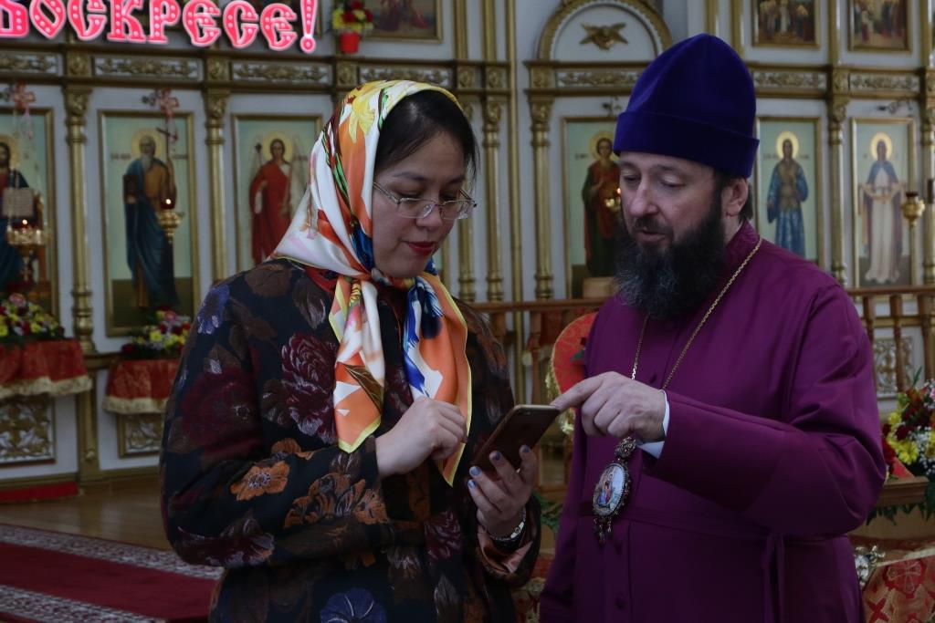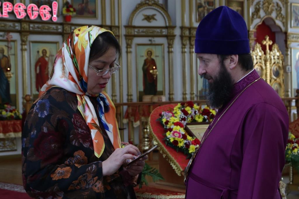 Высокую гостью встречали Преосвященнейший епископ Амфилохий и секретарь епархии диакон Илия Кван. В Андреевском соборе Асем Бековна пожелала благополучие и процветание казахстанскому народу.
