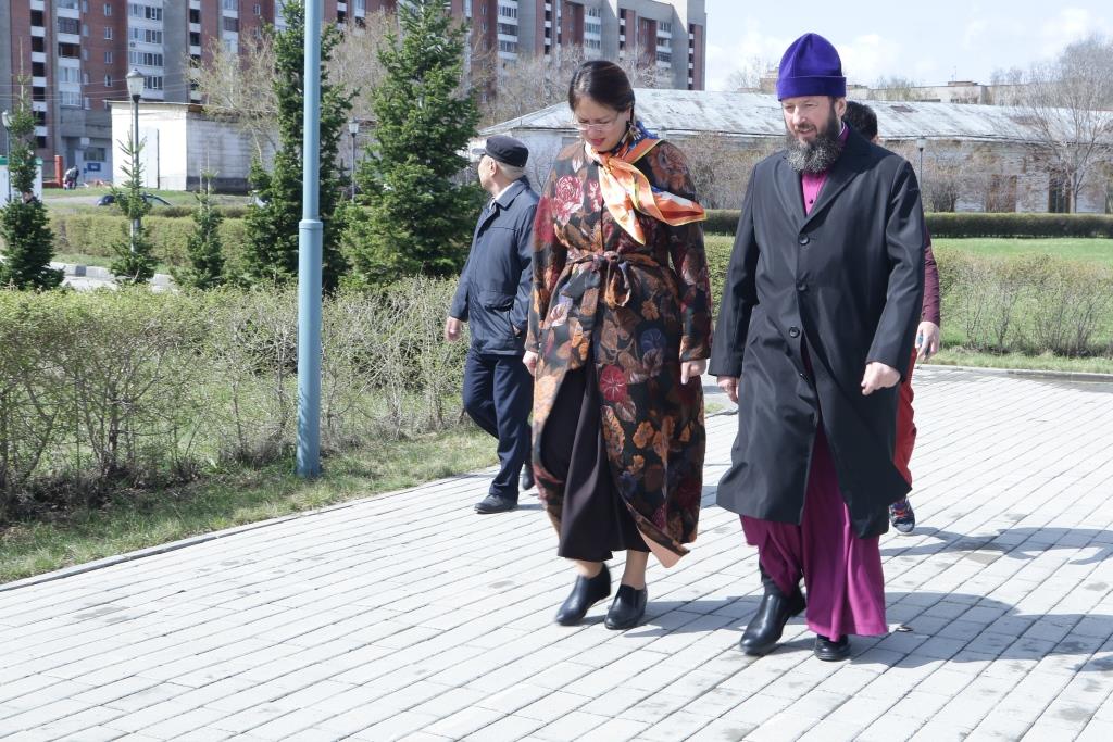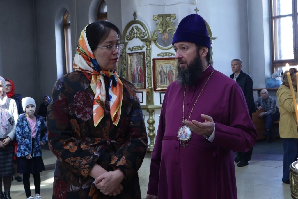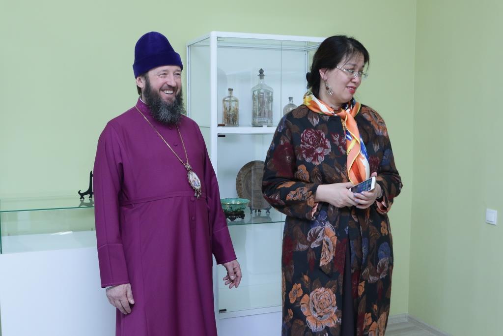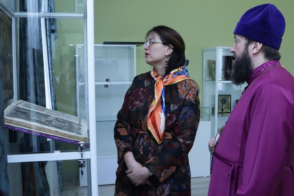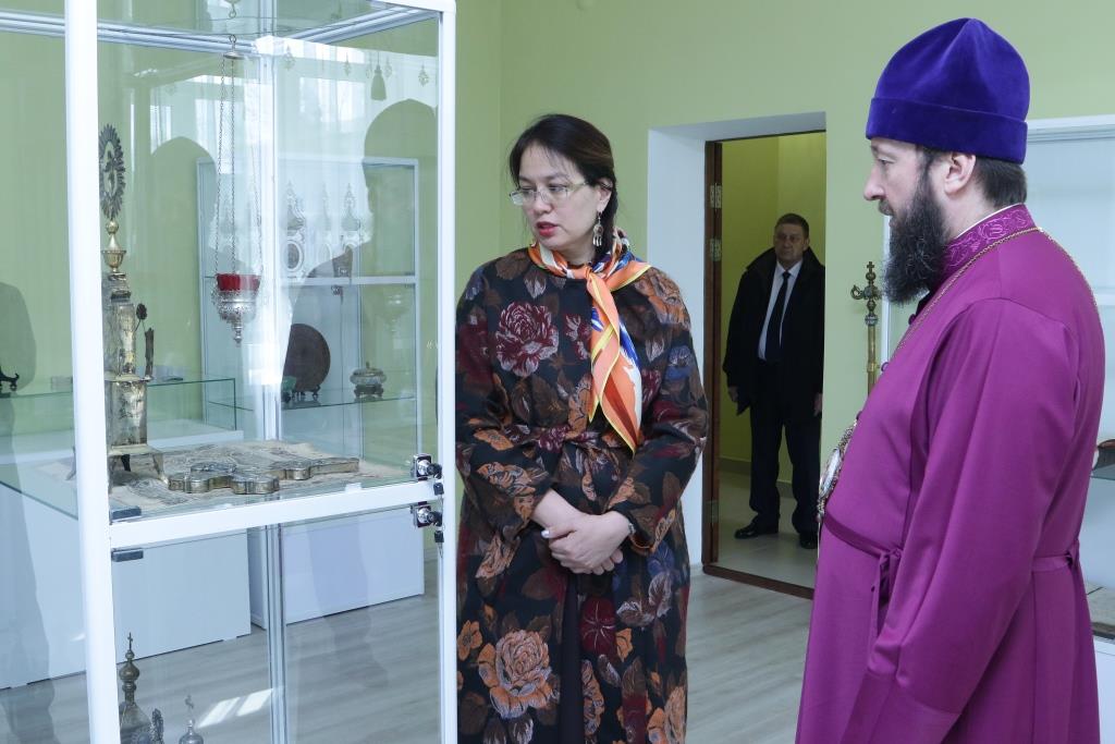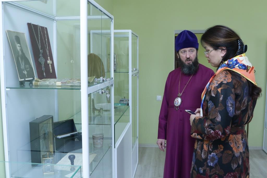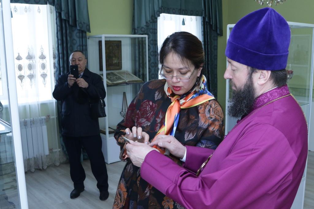 Затем гостья посетила здание духовно-административного корпуса Усть-Каменогорской и Семипалатинской епархии и расположенный в нем епархиальный церковно-археологический музей.