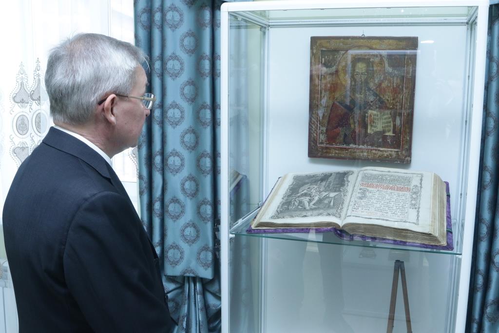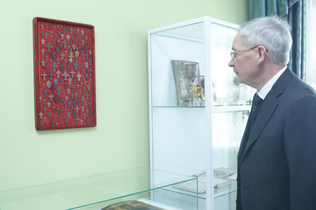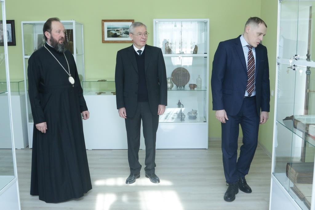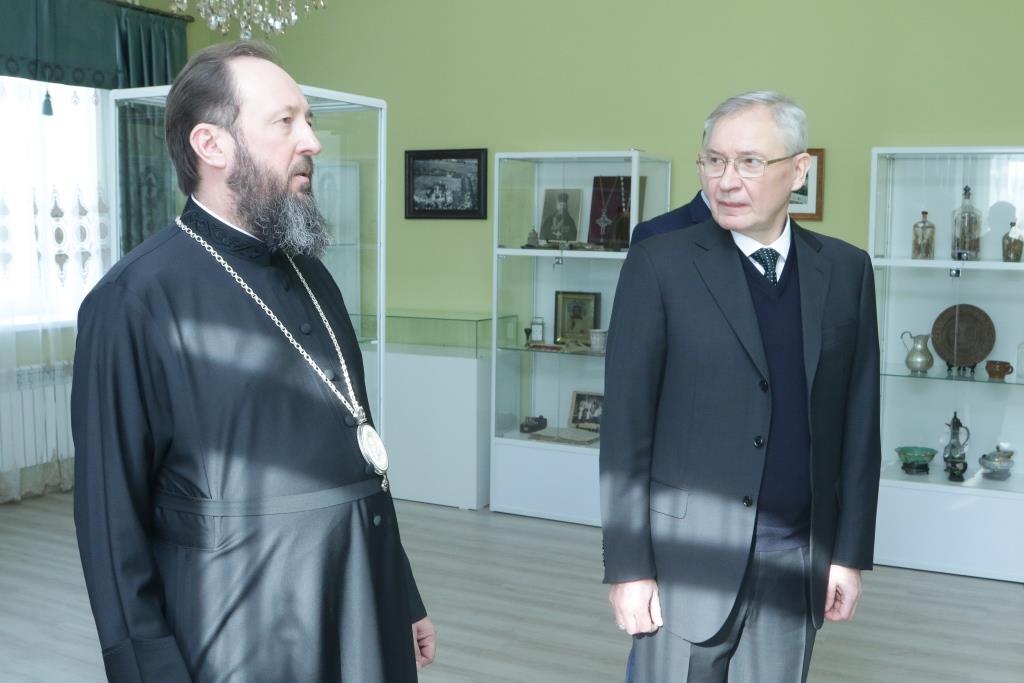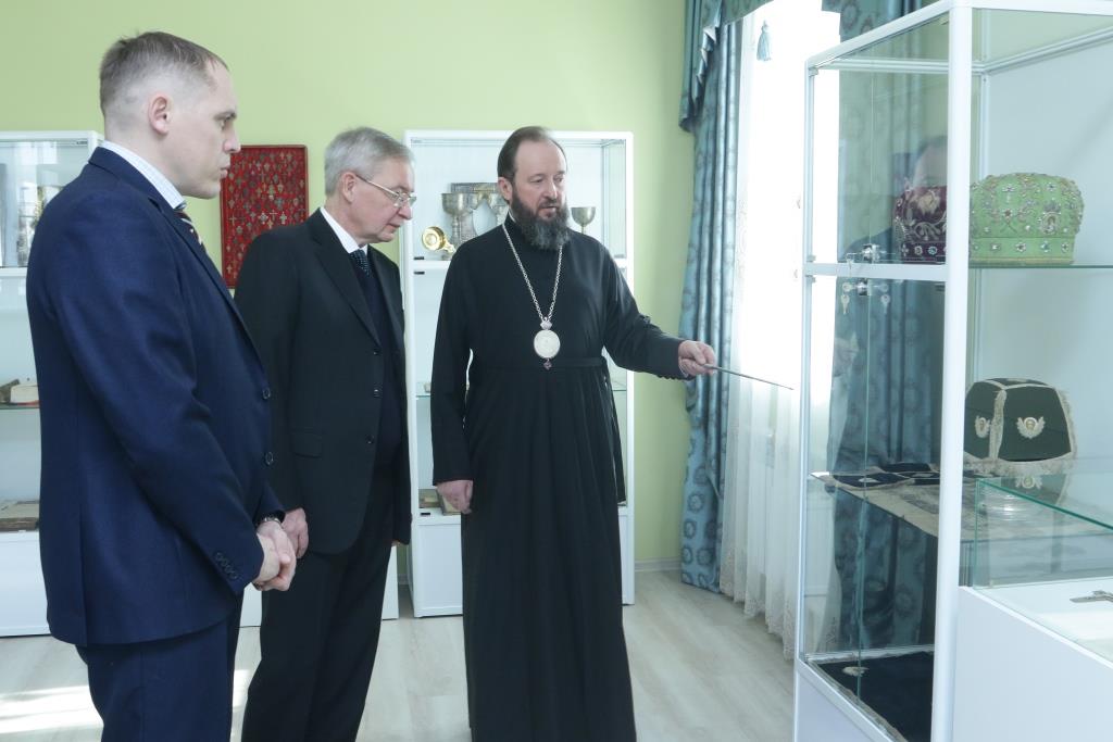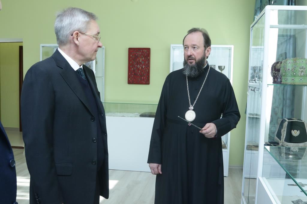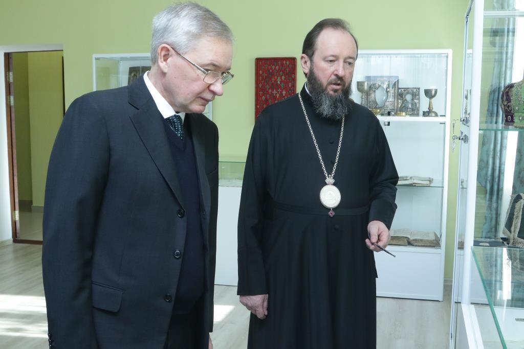 Дипломата встречали Управляющий епархией Преосвященнейший епископ Амфилохий и секретарь епархии диакон Илия Кван. Михаил Юрьевич ознакомился с работой епархиального управления и посетил Церковно-археологический кабинет, расположенный в здании Духовно-административного корпуса.