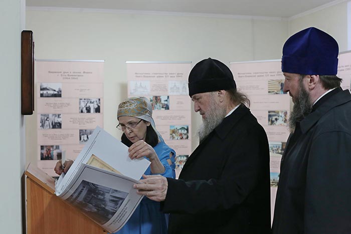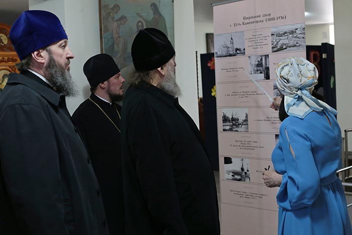 После приветственного слова митрополита Александра сотрудник этнографического музея столицы Рудного Алтая О.Н. Осерчева рассказала собравшимся о концепции выставки, обратив внимание на некоторые необычные фотографии. Фотовыставка состоит из трех тематических блоков: дореволюционного, советского и современного периодов истории Покровского собора.