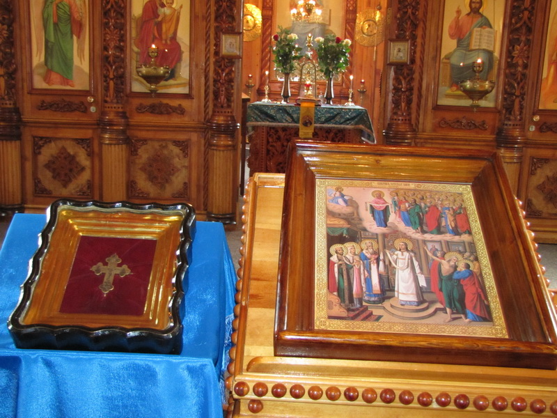 Святыни: Крест-мощевик с частицей Честного Животворящего Креста Господня и 29-ю частицами многоцелебных мощей святых угодников Божиих: честнаго славного Пророка, Предтечи и Крестителя Господня Иоанна, (Ян.7, Ф.24, М.25, Ин.24, Ав.29, С23, Окт.12), апостола и евангелиста Матфея, (+ 60 г.), (Ин.30, Н.16), апостола Андрея Первозванного, (+ 62 г.), (Ин.30, Н.30), апостола Филиппа, (I в.), (Ин.30, Н.14), великомученика Пантелеимона, (+ 305 г.), (Ил.27), великомученицы Варвары, (+ ок.306 г.), (Д.4), великомученика Меркурия, (III в.), (Н.24), мученицы Анастасии Римляныни, святителя Германа, архиепископа Казанского, (+ 1567 г.), (Ин.23, С.25, Н.6), святителей Гурия, архиепископа Казанского, (+ 1563 г.), (Ин.20, Окт.4, Д.5) и Варсонофия, епископа Тверского, (+ 1576 г.), (Ап.11, Окт.4), святителя Никифора исповедника, патриарха Константинопольского, (+ 828 г.), (Мр.13, Ин.2), преподобного Александра Свирского, (+ 1533 г.), (Ап.17, Ав.30), преподобного Саввы Сторожевского (Звенигородского), (+ 1406 г.), (Ян.19, Д.3), великомученика Феодора Стратилата, (+ 319 г.), (Ф.8, Ап.8), великомученика Феодора Тирона, (+ ок.306 г.), (Ф.17, в субботу 1-й седмицы Великого поста), мученика Каллиника, мучеников и исповедников Михаила, князя Черниговского, и болярина его Феодора, чудотворцев, (+ 1245 г.), (Ф.14, С.20), благоверного князя Константина, преподобной Евфимии, преподобной Марфы, матери Симеона Дивногорца, (+ 551 г.), (Ил.4), мученика Евгения, святителя Николая, архиепископа Мир Ликийских, чудотворца, (+ ок.345 г.), (М.9, Д.6), преподобного Максима Грека, (+ 1556 г.), (Ян.21), преподобного Николы Святоши, князя Черниговского, Печерского чудотворца, (+ 1143 г.), (С.28, Окт.14), преподобной Евфросинии, игумении Полоцкой, (+ 1173 г.), (М.23), преподобных Василия и Григория.
