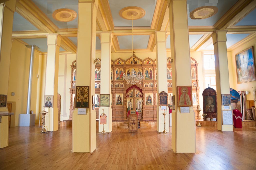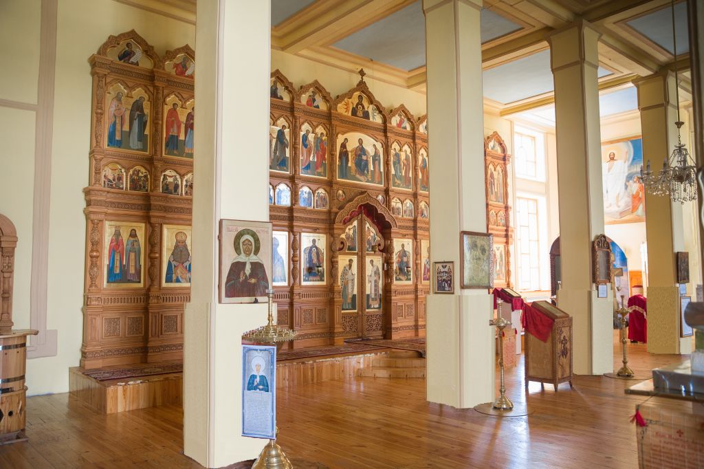 На иконостасе Никольского храма часть икон – это иконы с бывшего молельного дома, другая часть – это иконы, написанные в 1999-2000 годы местным художником. Клирос расположен на балконе в левой части храма. А в правой - на стене висит довольно большое полотно размером 2х3 метра, на котором изображена икона «Успение Пресвятой Богородицы». Это икона когда-то принадлежала Успенскому храму, разрушенному в годы советской власти. Полотно было очень сильно повреждено, но каким-то чудом все же уцелело от полного уничтожения. И в 2008 году местная художница Елена Федорова буквально по крупицам восстановила эту икону.