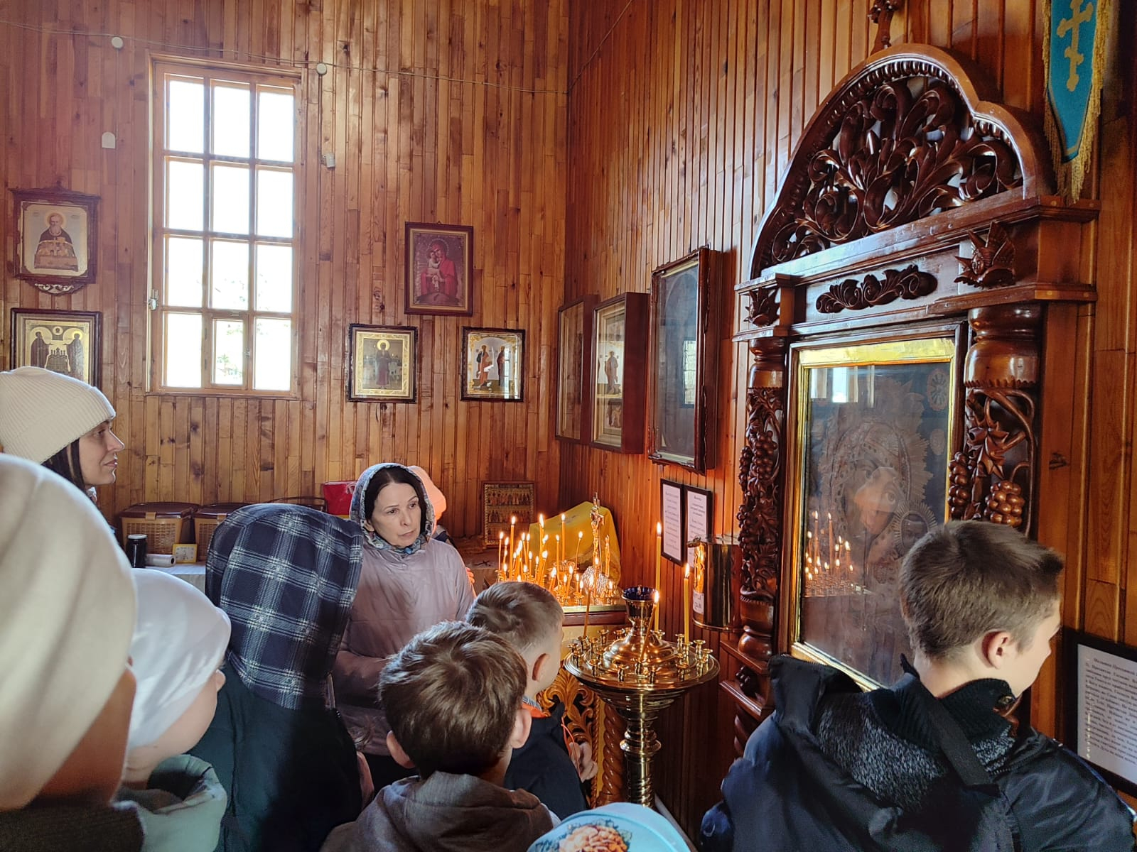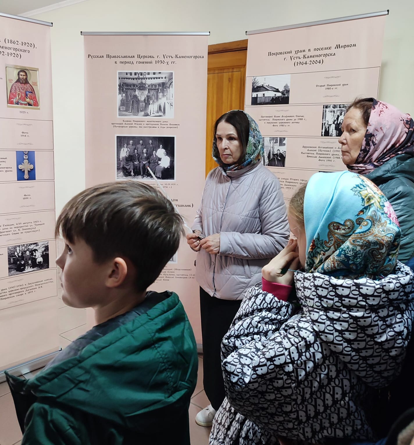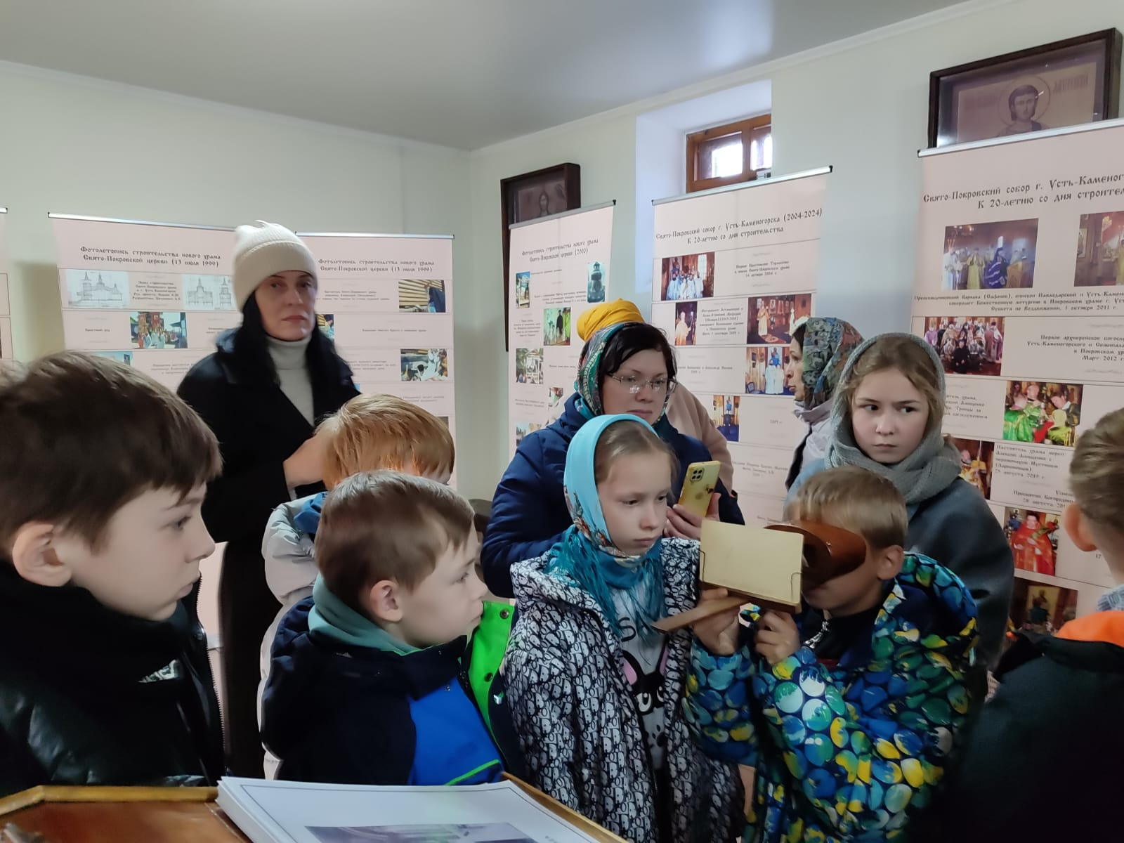 Старший научный сотрудник Восточно-Казахстанского областного этнографического музея-заповедника Осерчева Ольга Николаевна провела интересную экскурсию по Свято-Покровскому собору, познакомила детей со старинными иконами, находящимися в храме. Затем все спустились в нижний Крестильный храм, где прослушали интересный рассказ по истории Свято- Покровского собора, построенного в Усть-Каменогорске в 1888 году и разрушенного безбожной властью в 1936 году. О скитаниях Покровского прихода по различным молельным домам Усть-Каменогорска в годы Советской власти, и наконец, о последнем его пристанище в поселке Мирный. Здесь в 2004 году стараниями настоятеля иеромонаха Амфилохия (Бондаренко) – (ныне Высокопреосвященнейший архиепископ Усть-Каменогорский и Семипалатинский Амфилохий) был построен новый деревянный Покровский собор, который стал духовным преемником разрушенного Градоустькаменогорского Покровского собора и одним из важнейших центров духовной жизни епархии в наше время.