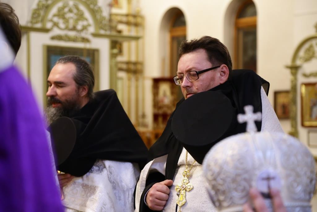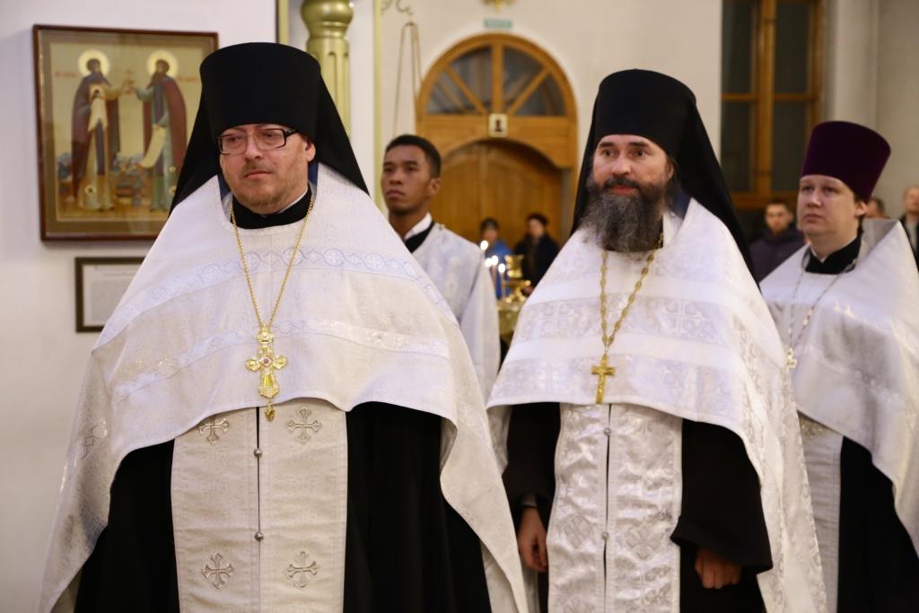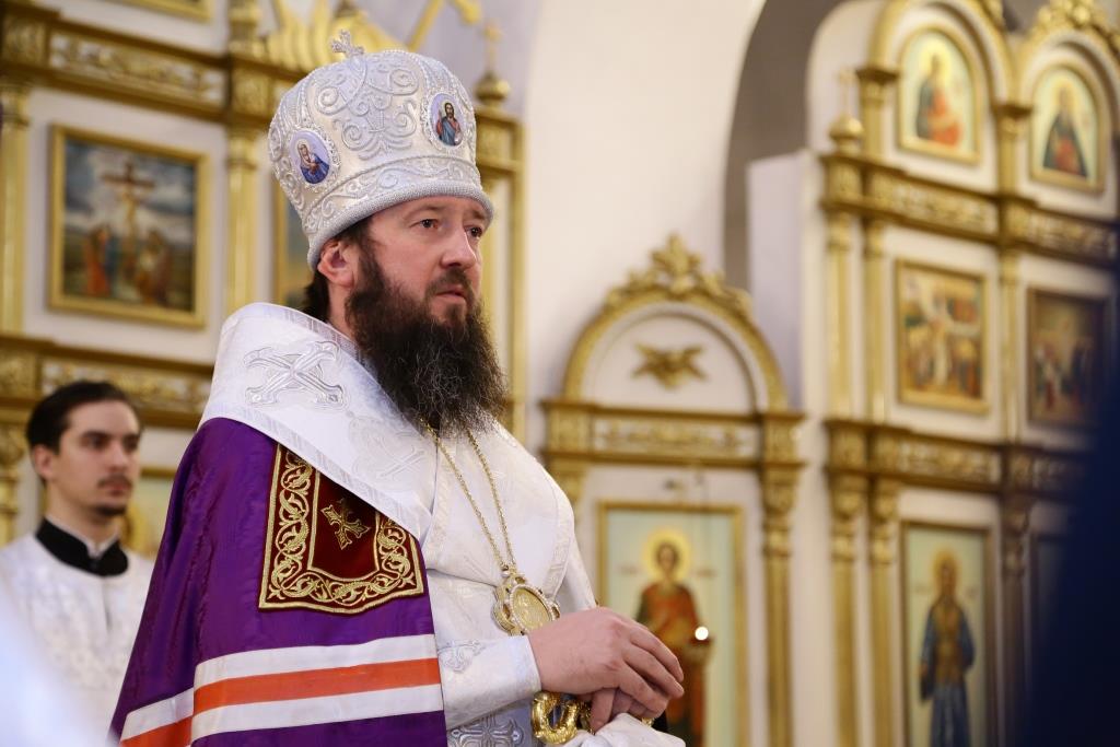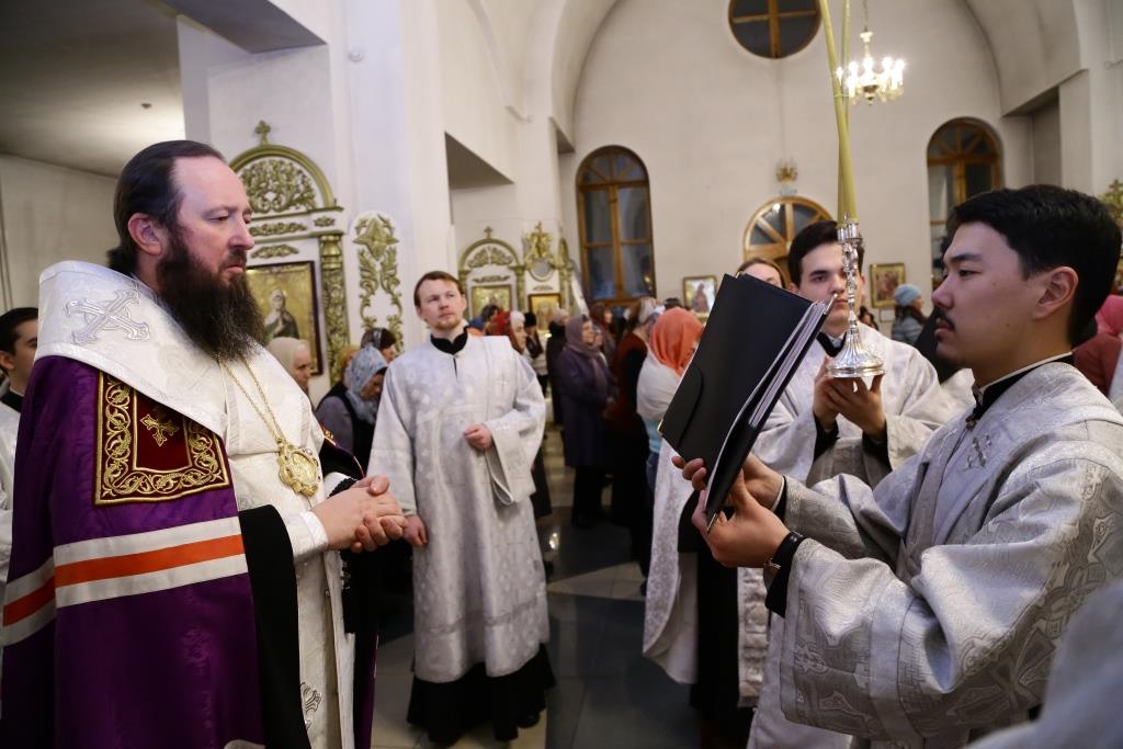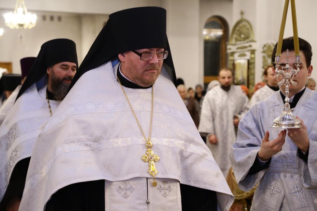 Его Преосвященству сослужили: и.о.секретаря епархии иерей Евгений Яганов, председатель Комисси по делам молодёжи иерей Вячеслав Гутов, настоятели храмов города, руководители епархиальных отделов и комиссий в священном сане, соборное духовенство.