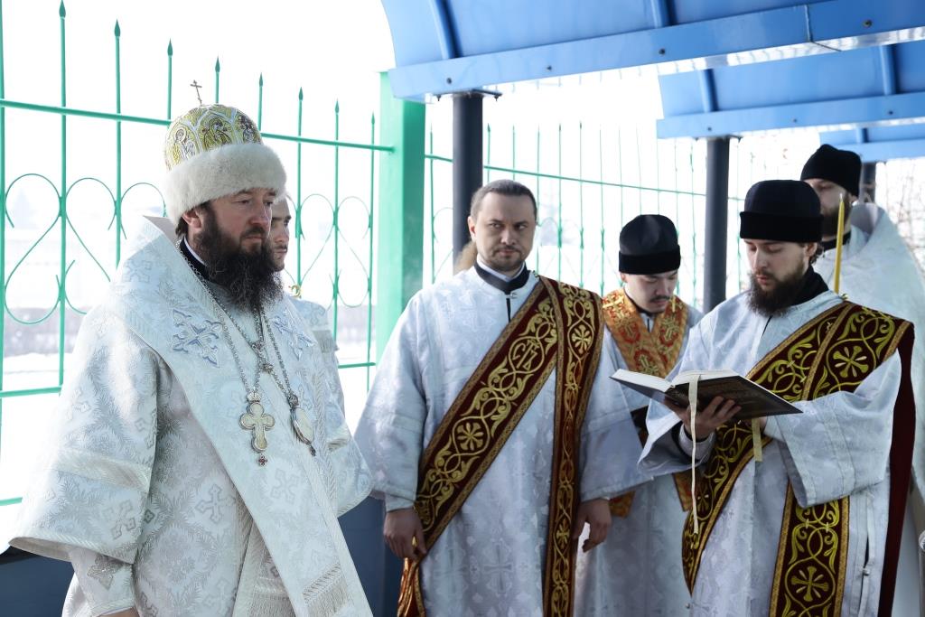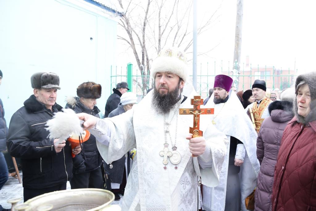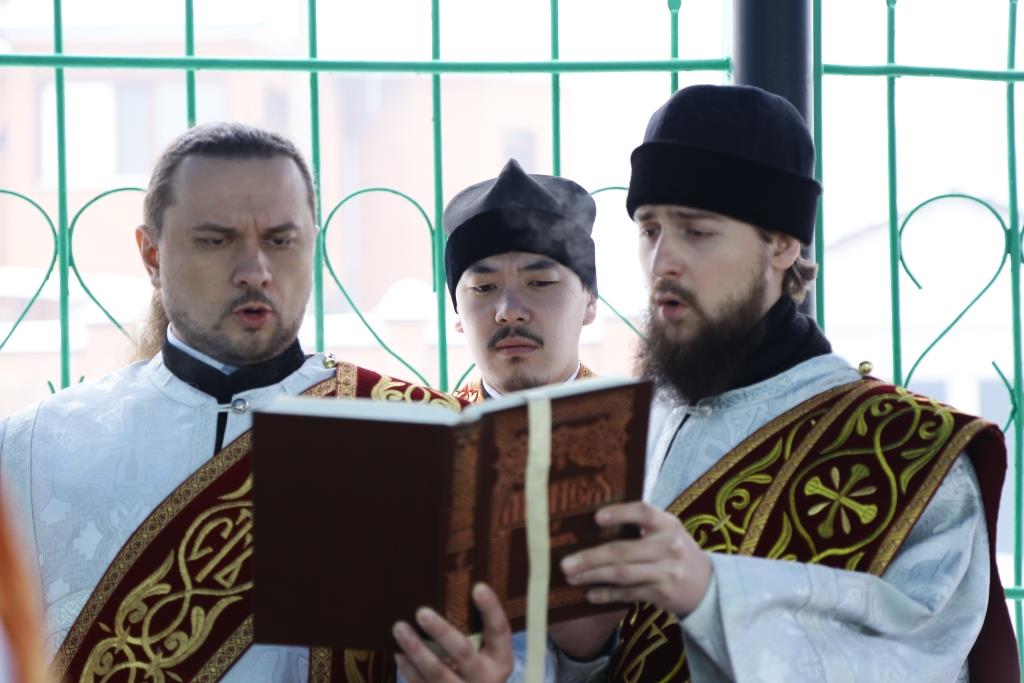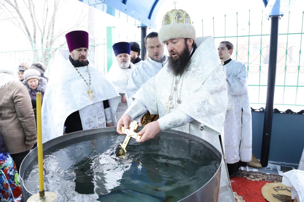 После заамвонной молитвы, при пении «Глас Господень на водах» Архипастырь и сослужащее духовенство вышли из храма соборную площадь, где в специально устроенной купели было совершено великое освящение воды.