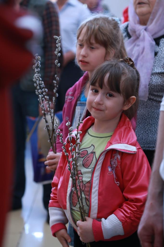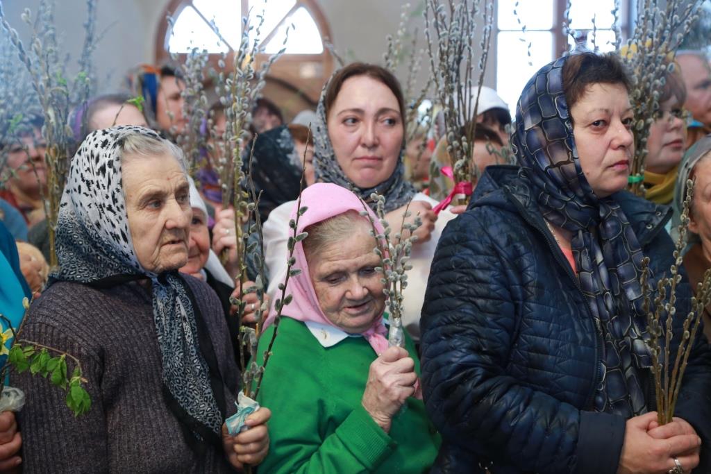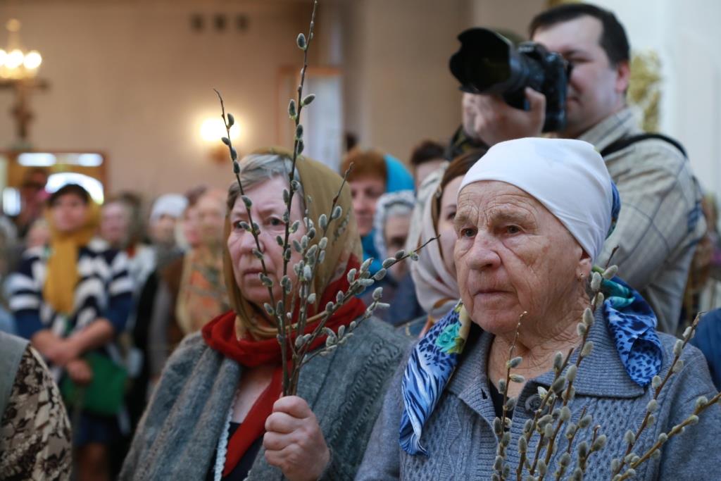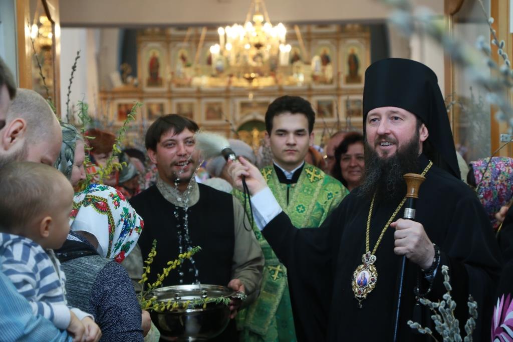 Божественная Литургия завершилась славлением празднику: хор и духовенство исполнили тропарь и кондак Входа Господня в Иерусалим, и по окончании пения Архипастырь окропил святой водой ветви вербы, принесенные верующими.