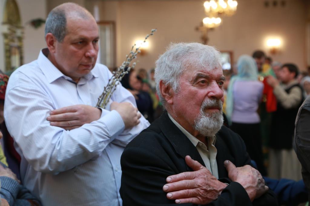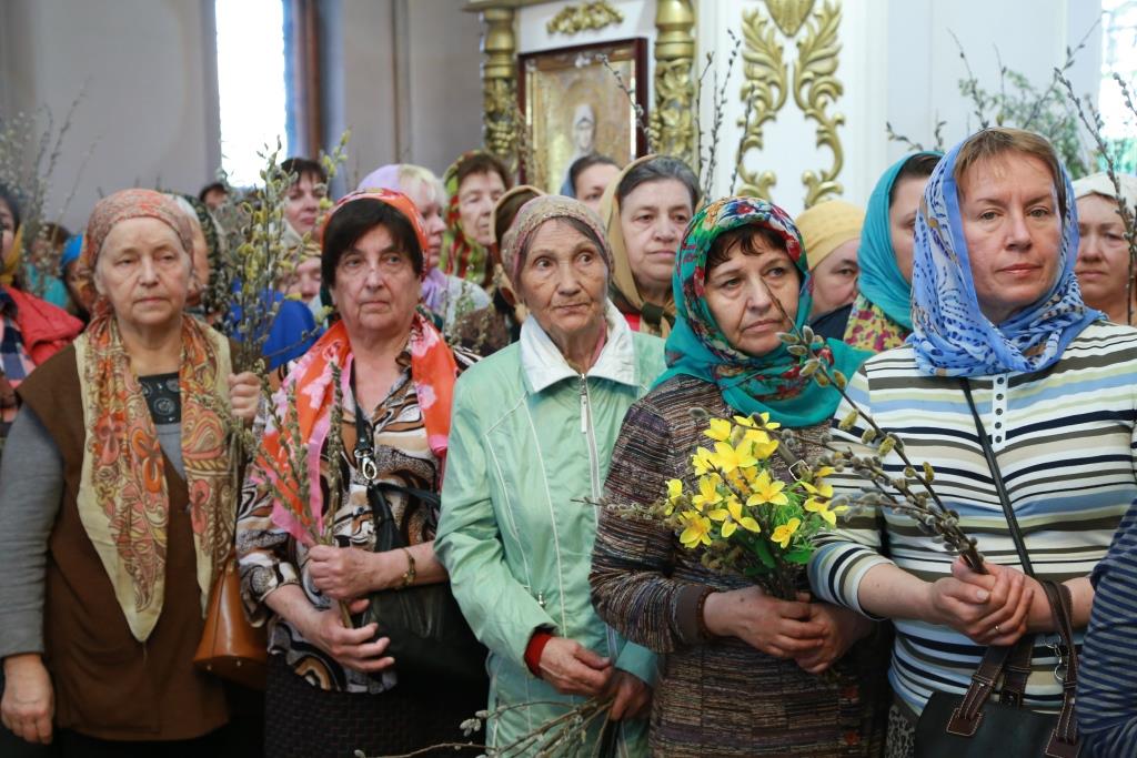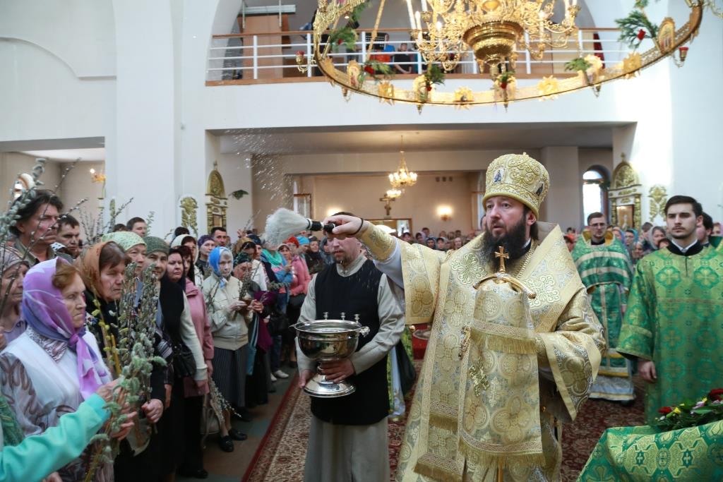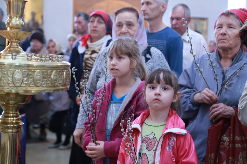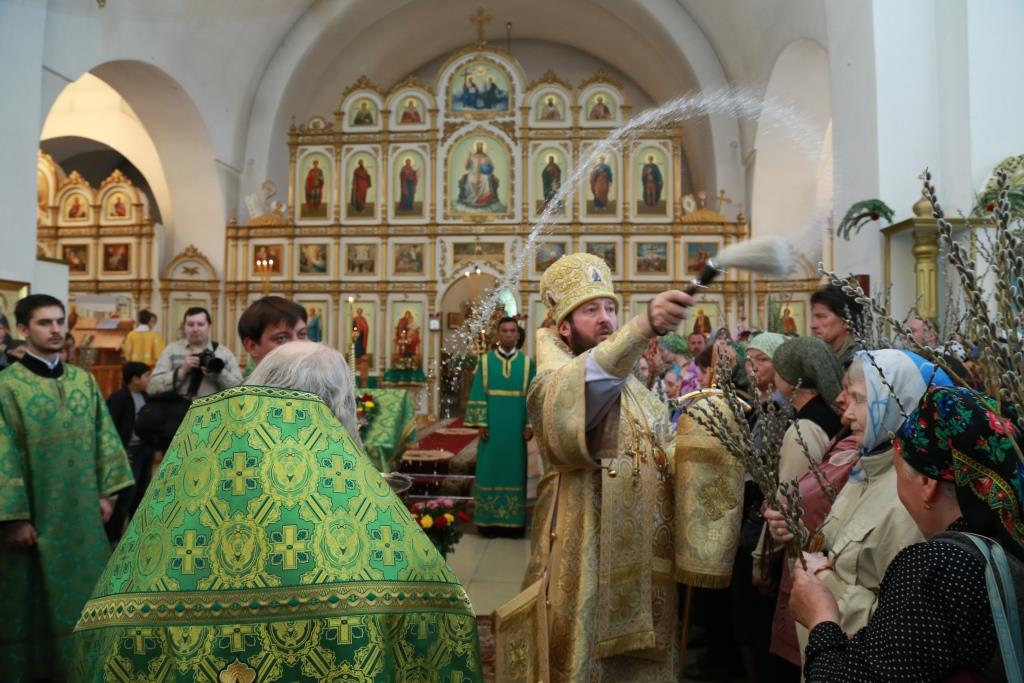 Божественная Литургия завершилась славлением празднику: хор и духовенство исполнили тропарь и кондак Входа Господня в Иерусалим, и по окончании пения Архипастырь окропил святой водой ветви вербы, принесенные верующими.