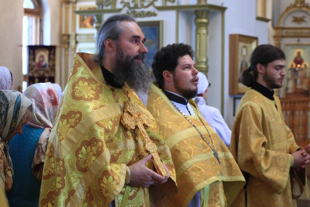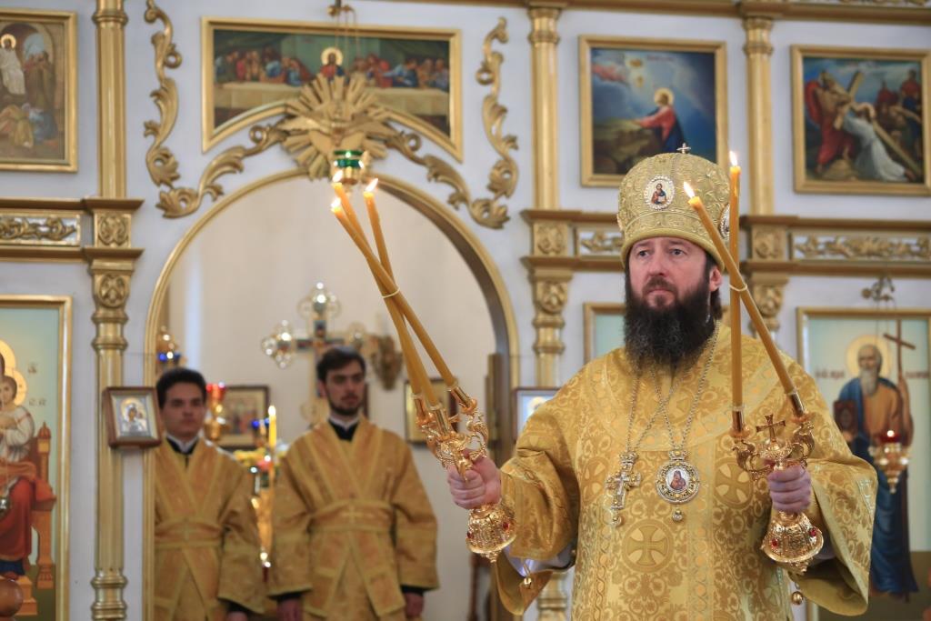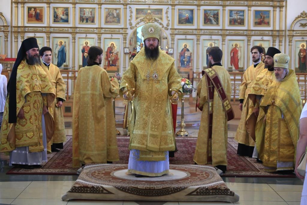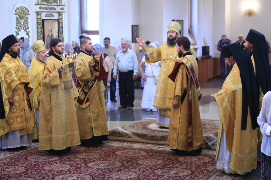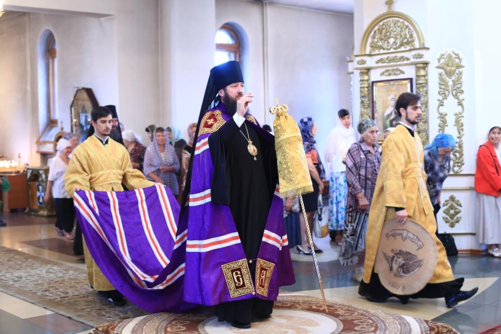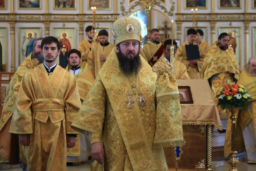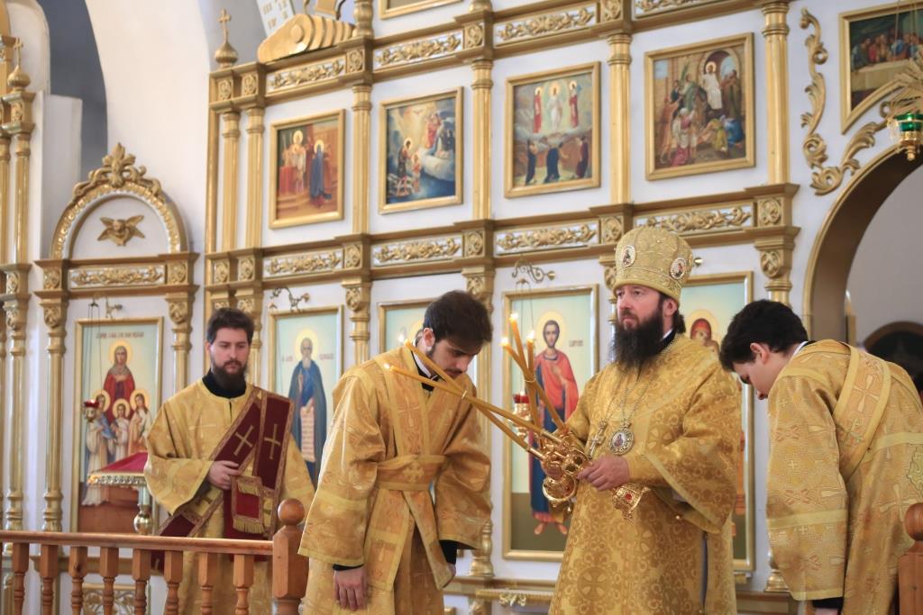 Его Преосвященству сослужили: духовник епархии архимандрит Спиридон (Теплухин), ключарь собора иеромонах Никодим (Авдеев), клирик собора иеромонах Севастиан (Андрющенко), диаконский чин возглавил протодиакон Георгий Засыпкин.