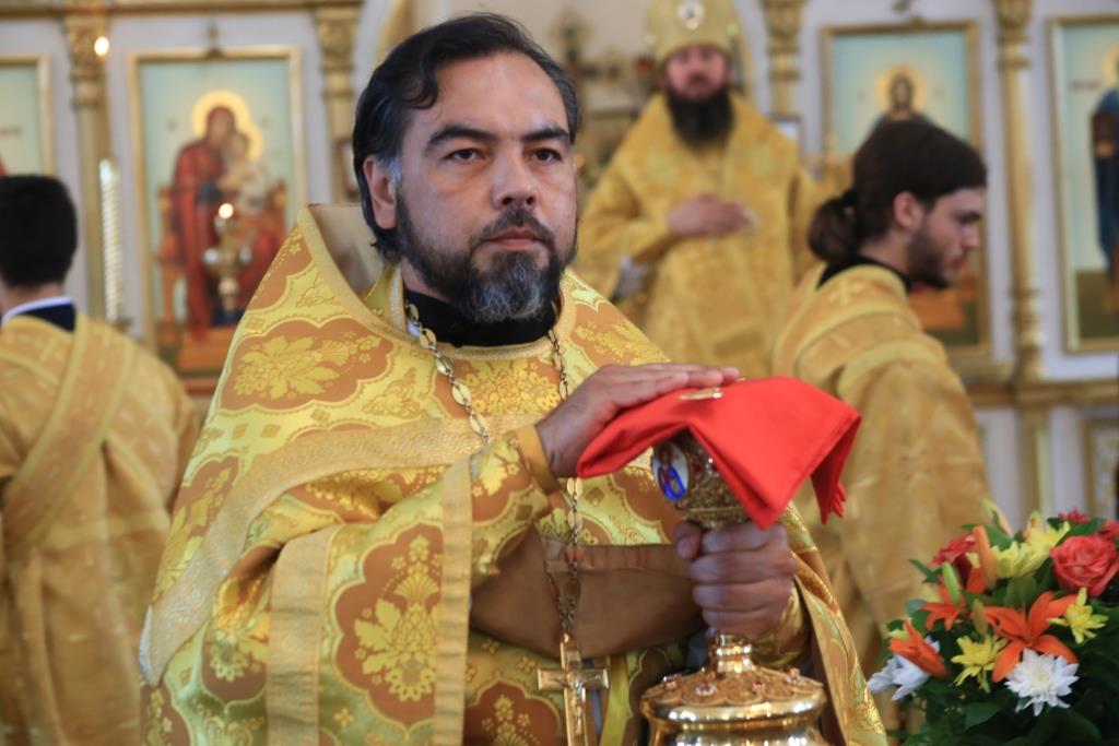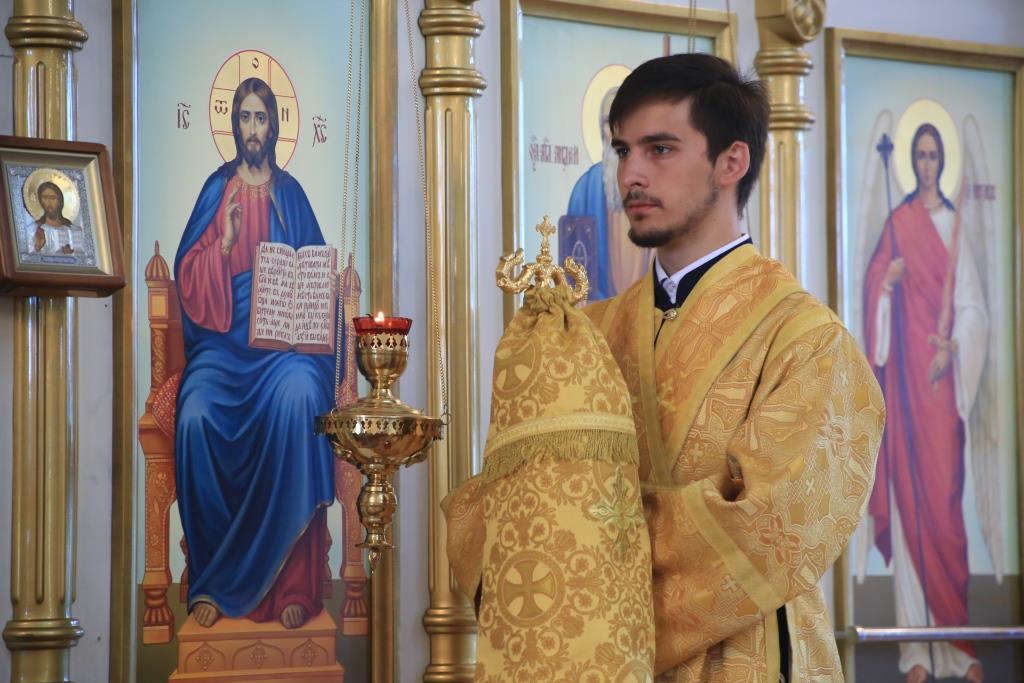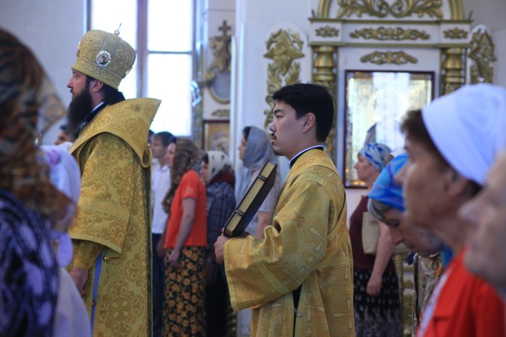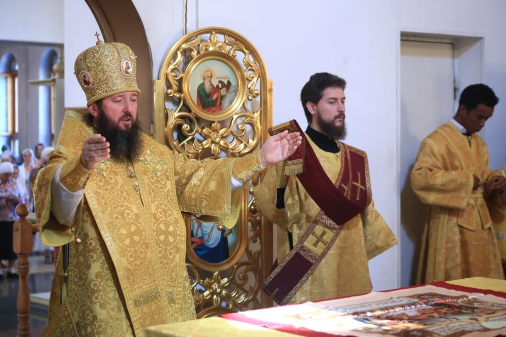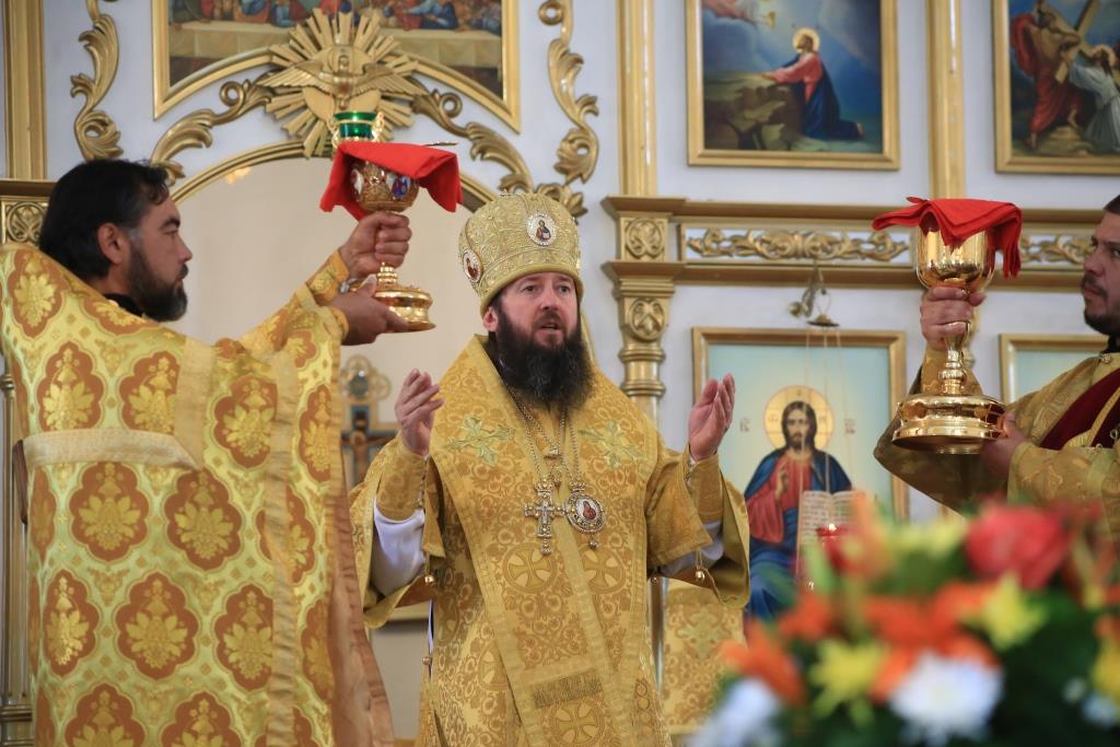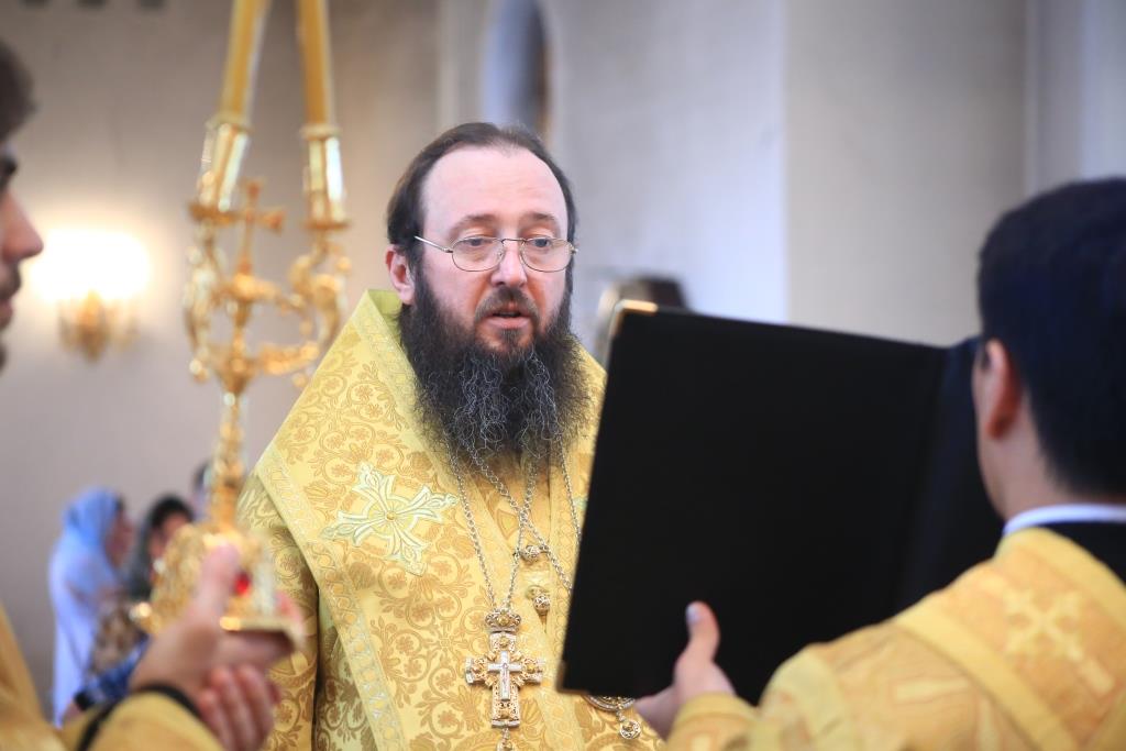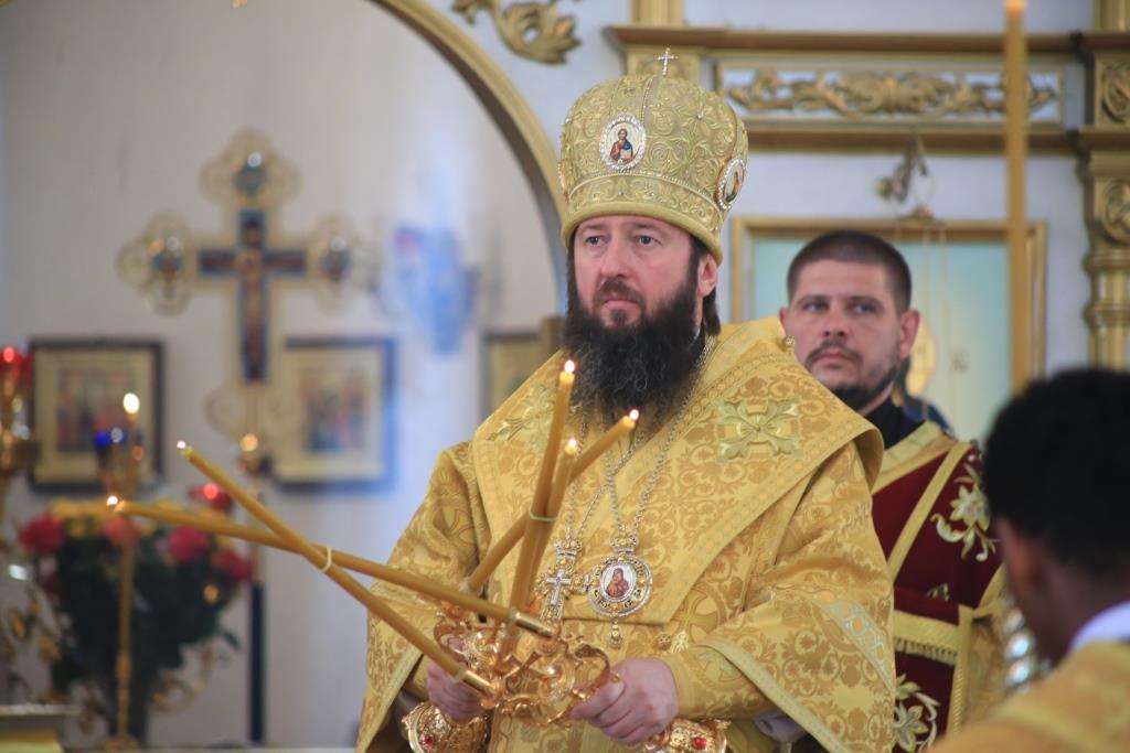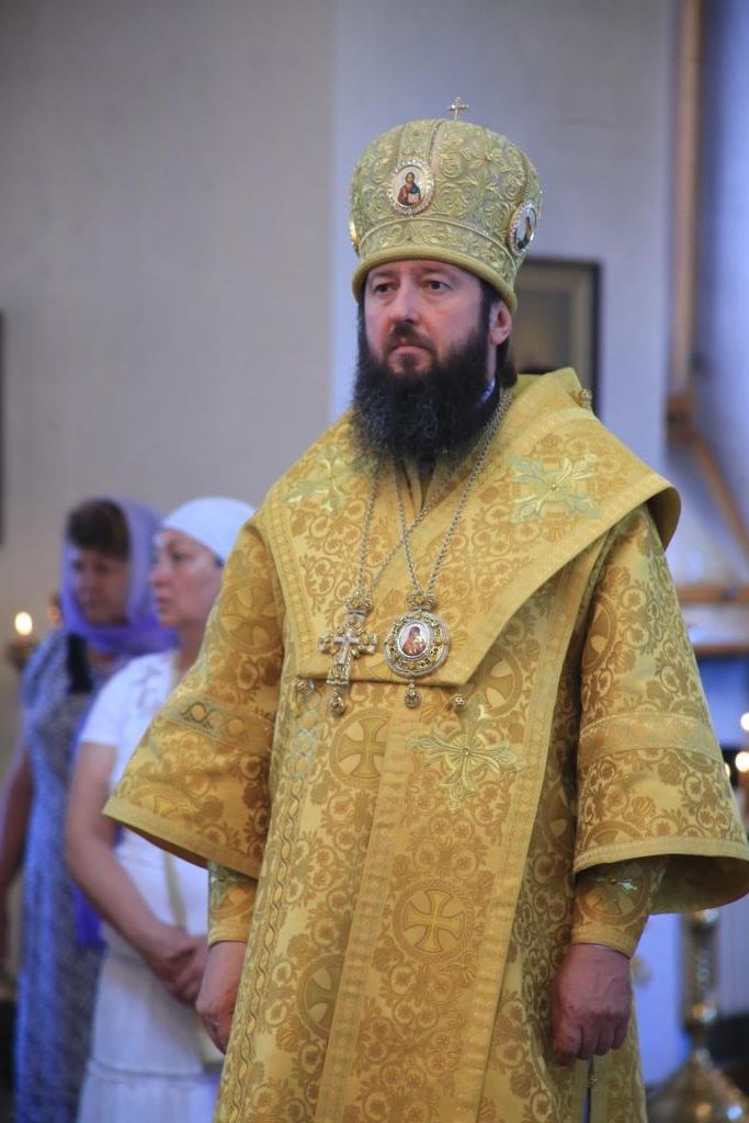 Его Преосвященству сослужили: духовник епархии архимандрит Спиридон (Теплухин), ключарь собора иеромонах Никодим (Авдеев), клирик собора иеромонах Севастиан (Андрющенко), диаконский чин возглавил протодиакон Георгий Засыпкин.
