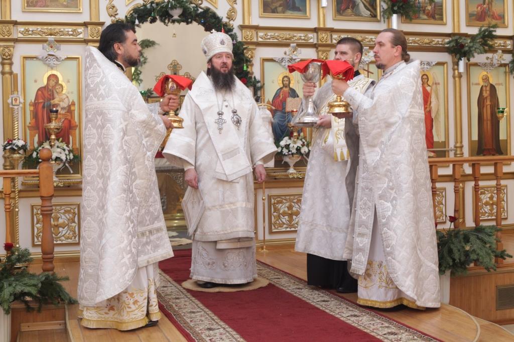 В полночь началась праздничная Божественная Литургия. За Богослужением Его Преосвященству сослужили: духовник епархии архимандрит Спиридон (Теплухин), ключарь Андреевского собора иеромонах Никодим (Авдеев), клирики собора иерей Алексий Клепиков, иеромонах Севастиан (Андрющенко), иерей Константин Дьяков, протодиаконы Георгий Засыпкин и Андрей Дудник, иеродиакон Мефодий (Шевчук).