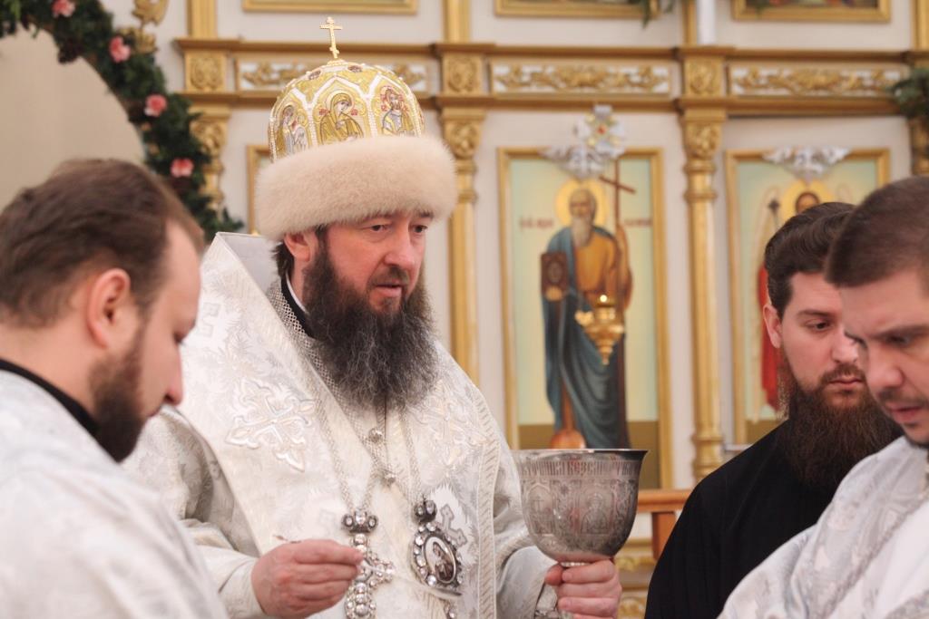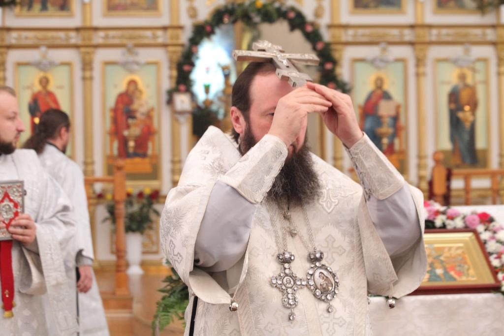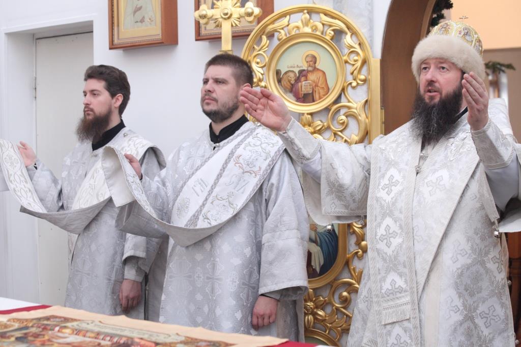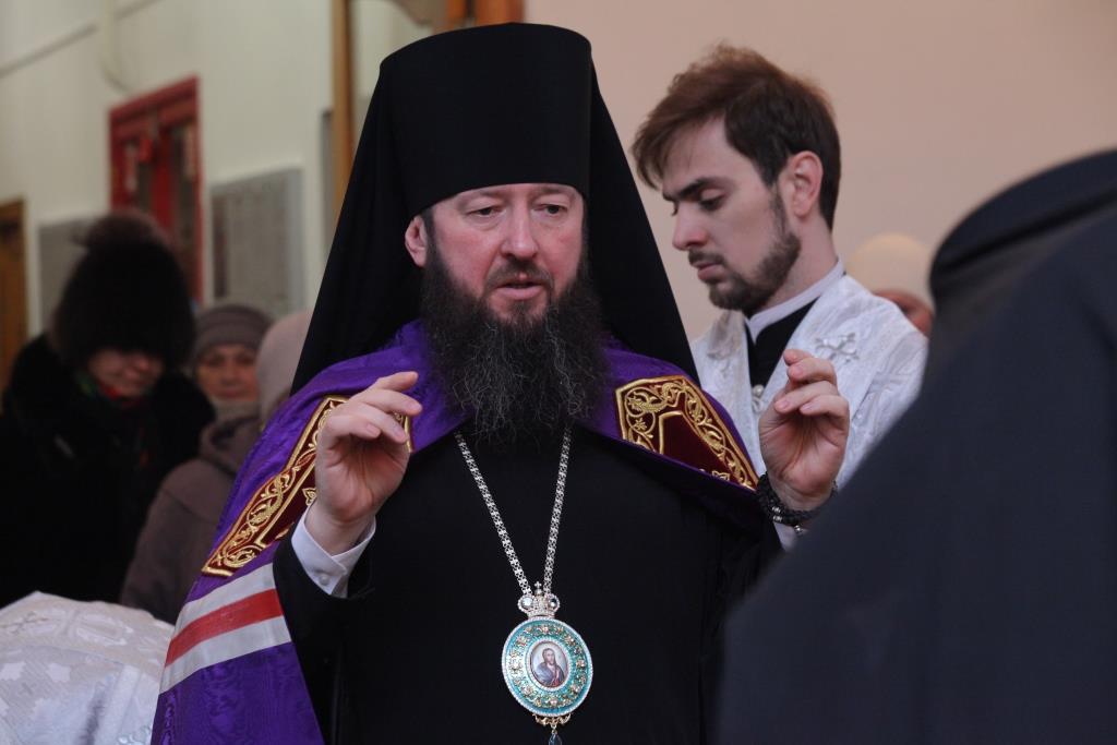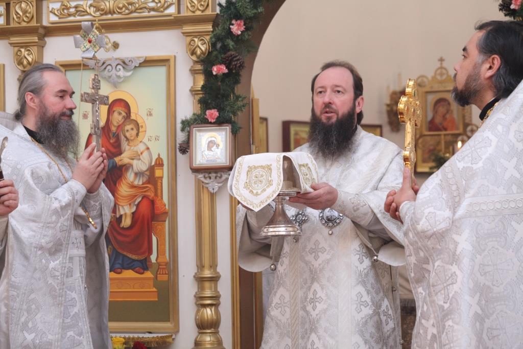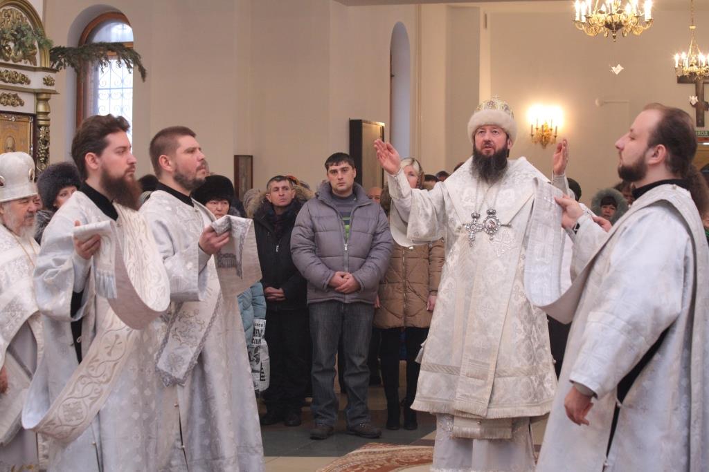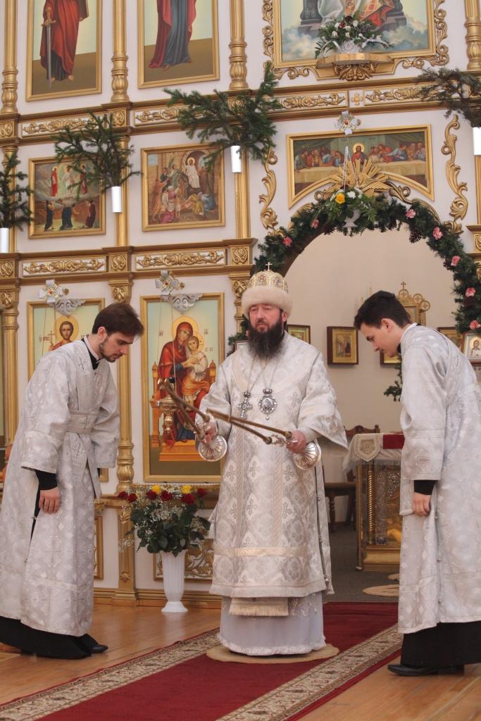Его Преосвященству сослужили: духовник епархии архимандрит Спиридон (Теплухин), ключарь Андреевского собора иеромонах Никодим (Авдеев), клирик собора иеромонах Севастиан (Андрющенко), протодиаконы Георгий Засыпкин и Андрей Дудник, иеродиакон Мефодий (Шевчук), диакон Алексий Горбунов.