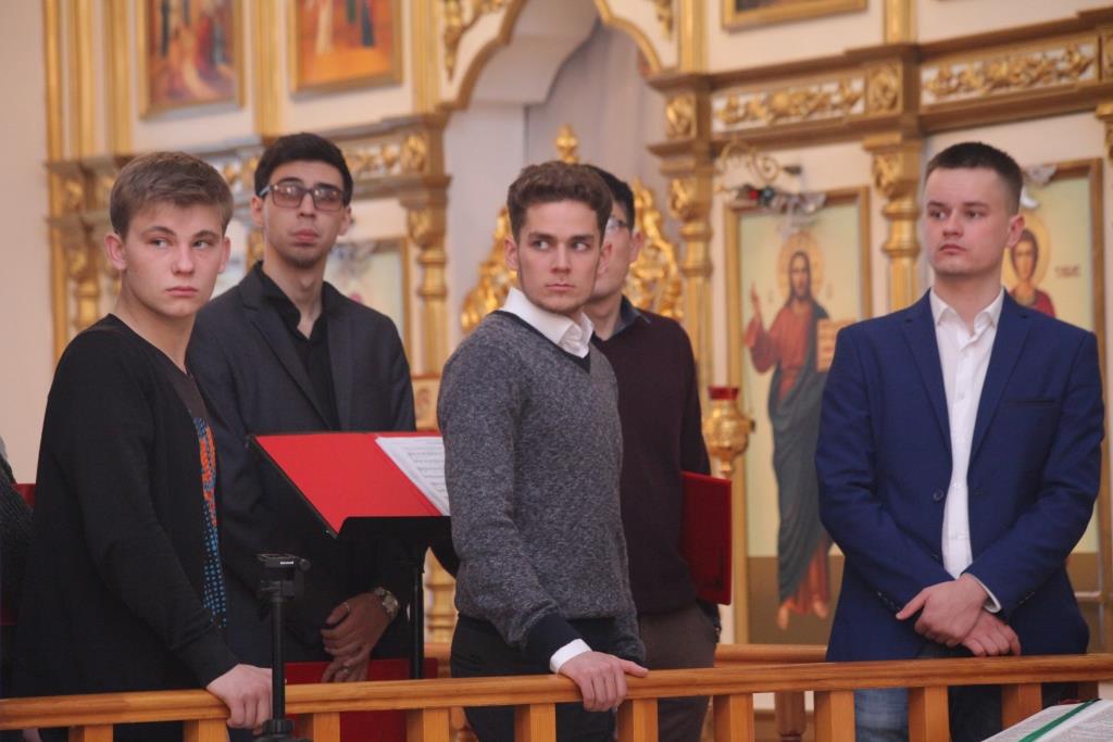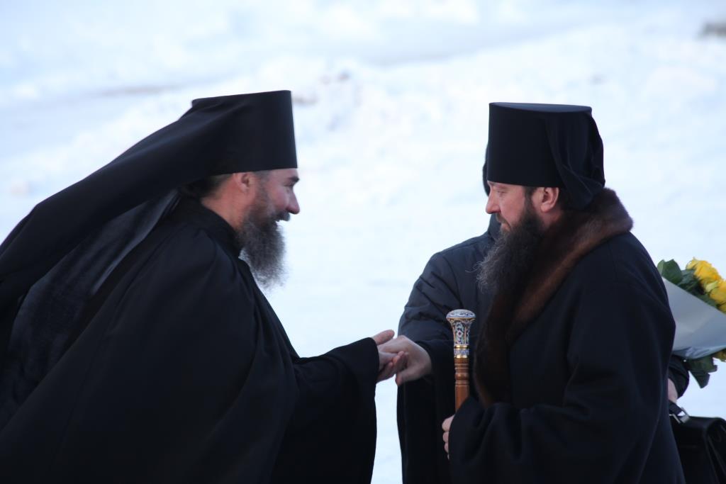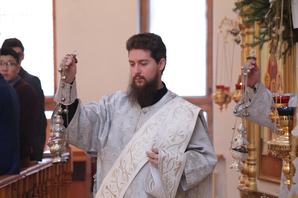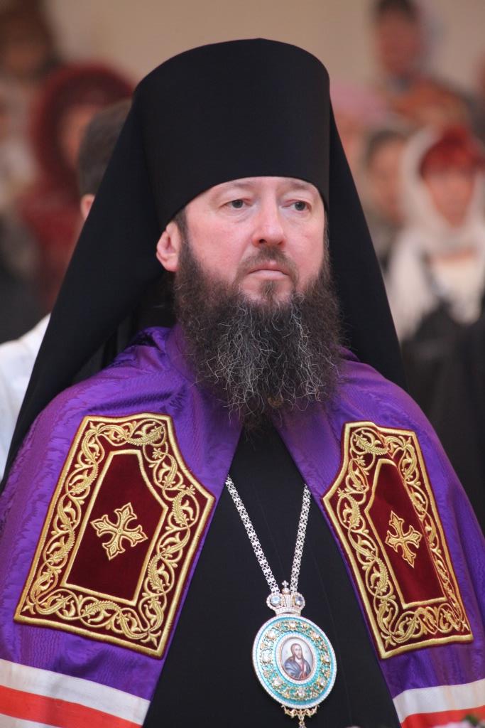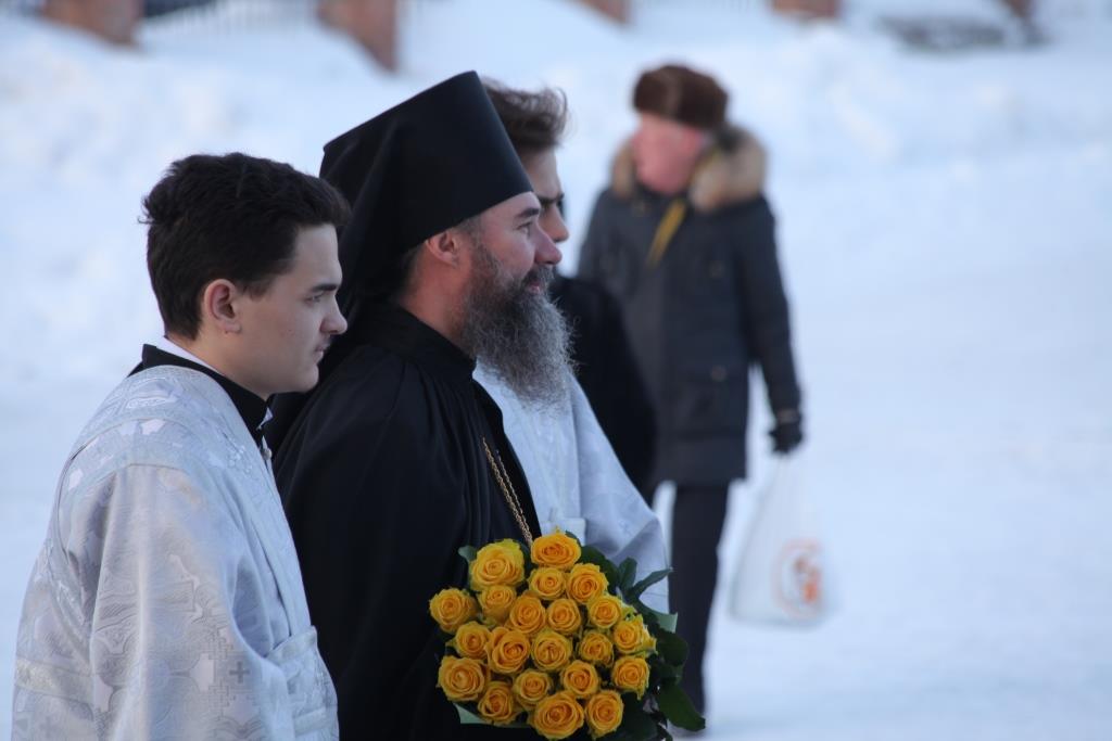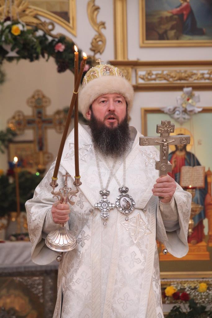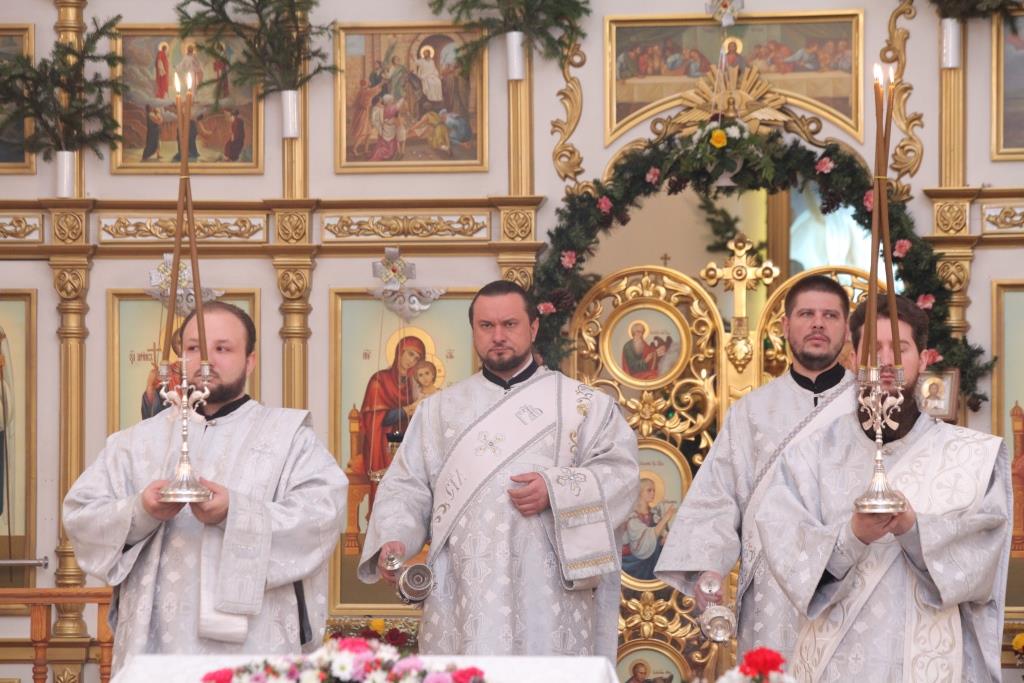Его Преосвященству сослужили: духовник епархии архимандрит Спиридон (Теплухин), ключарь Андреевского собора иеромонах Никодим (Авдеев), клирик собора иеромонах Севастиан (Андрющенко), протодиаконы Георгий Засыпкин и Андрей Дудник, иеродиакон Мефодий (Шевчук), диакон Алексий Горбунов.