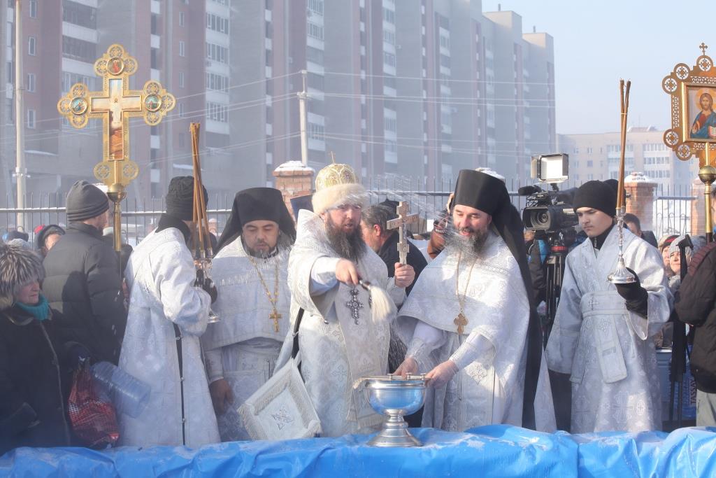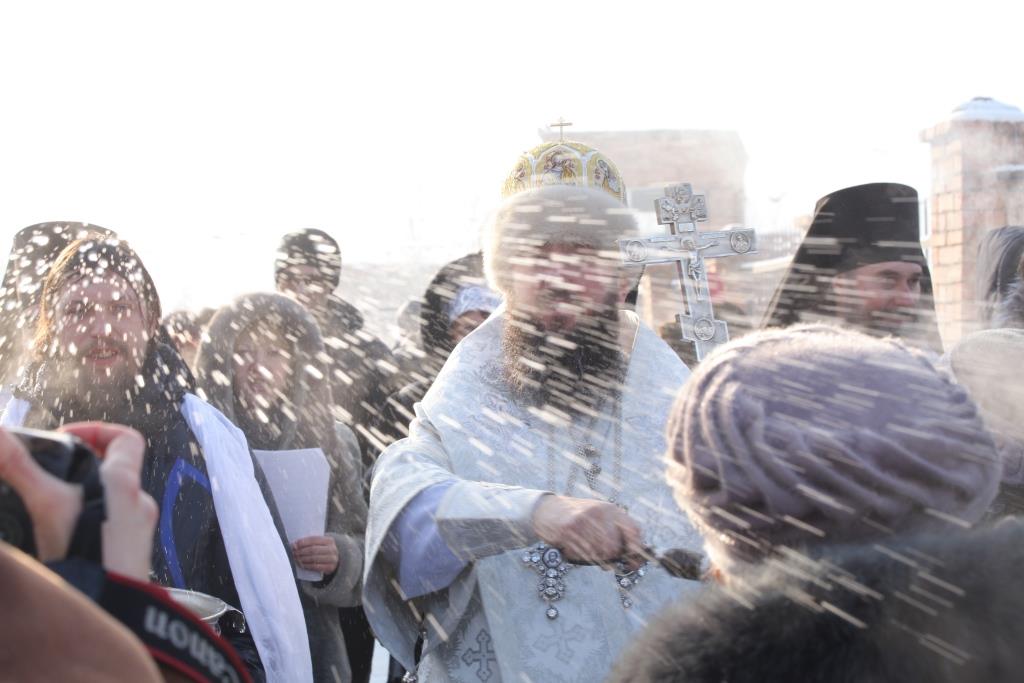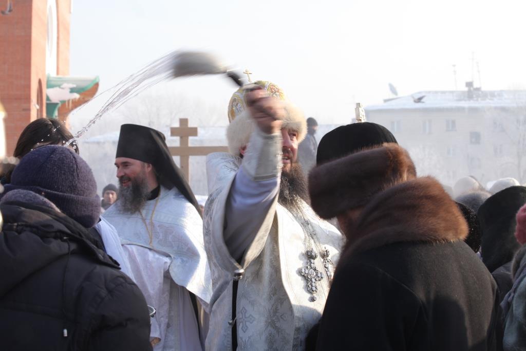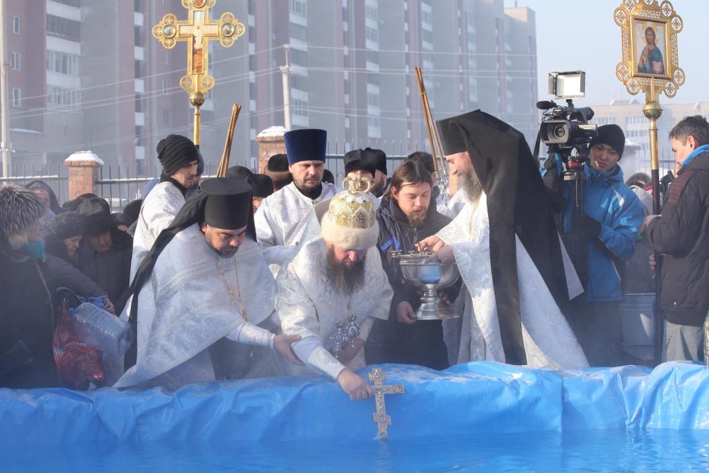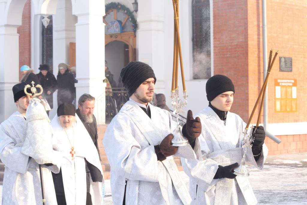 После заамвонной молитвы, при пении праздничных тропарей тропарей «Глас Господень на водах», прославляющих милость Божию к Своему творению, Архипастырь и священнослужители вышли из храма на соборную площадь, где в специально устроенной купели при большом стечении молящихся было совершено великое освящение воды. После освящения епископ Амфилохий окропил молящихся святой водой. По окончании Богослужения Архипастырь обратился к верующим со словами проповеди.