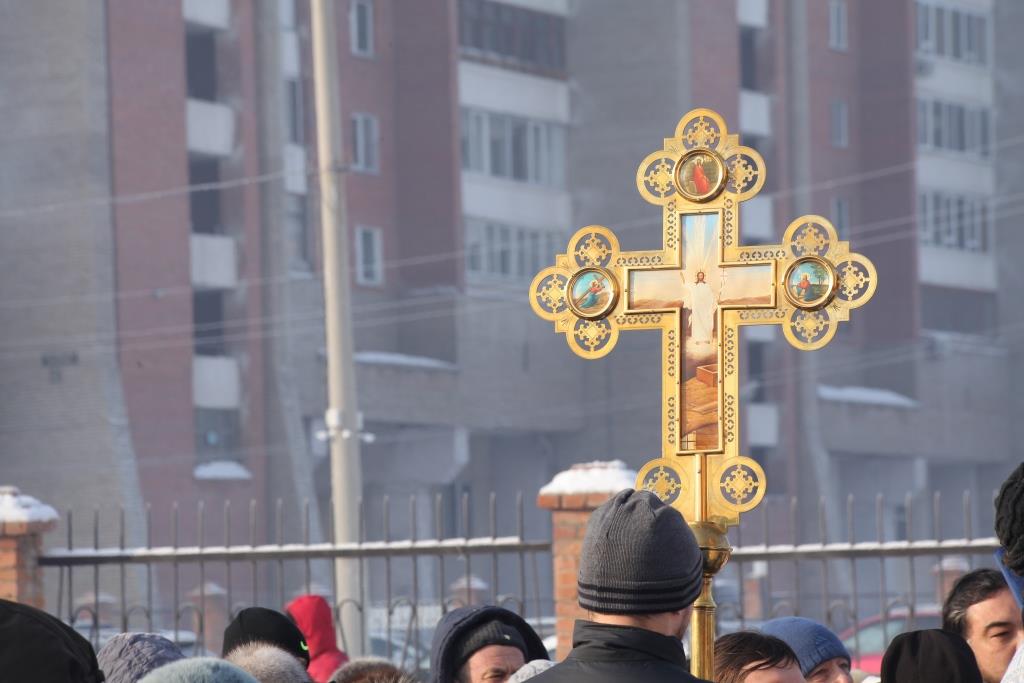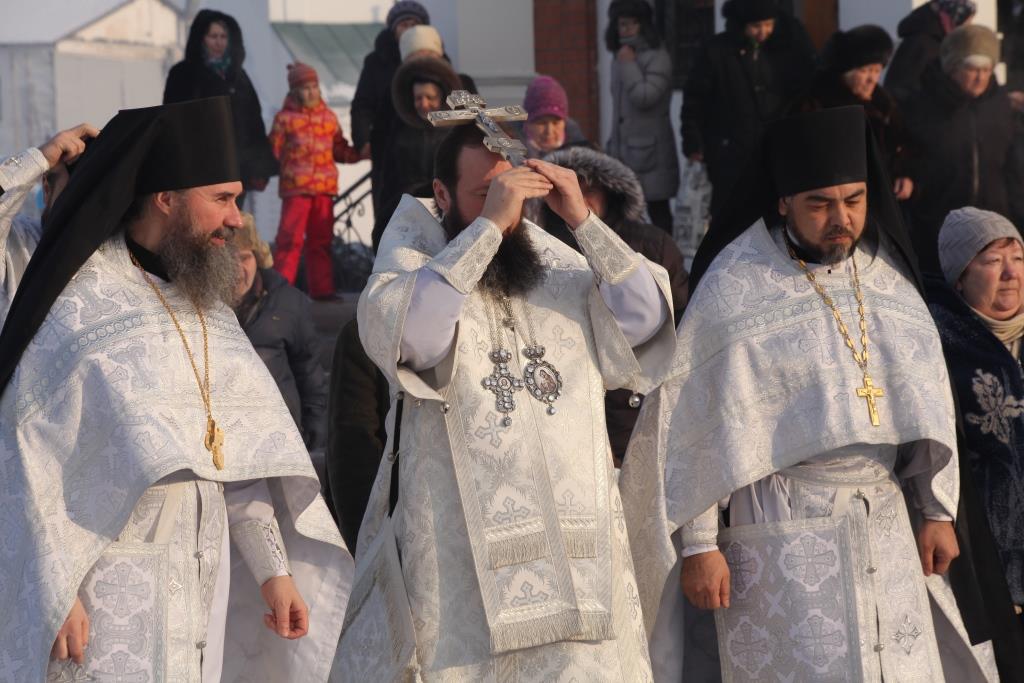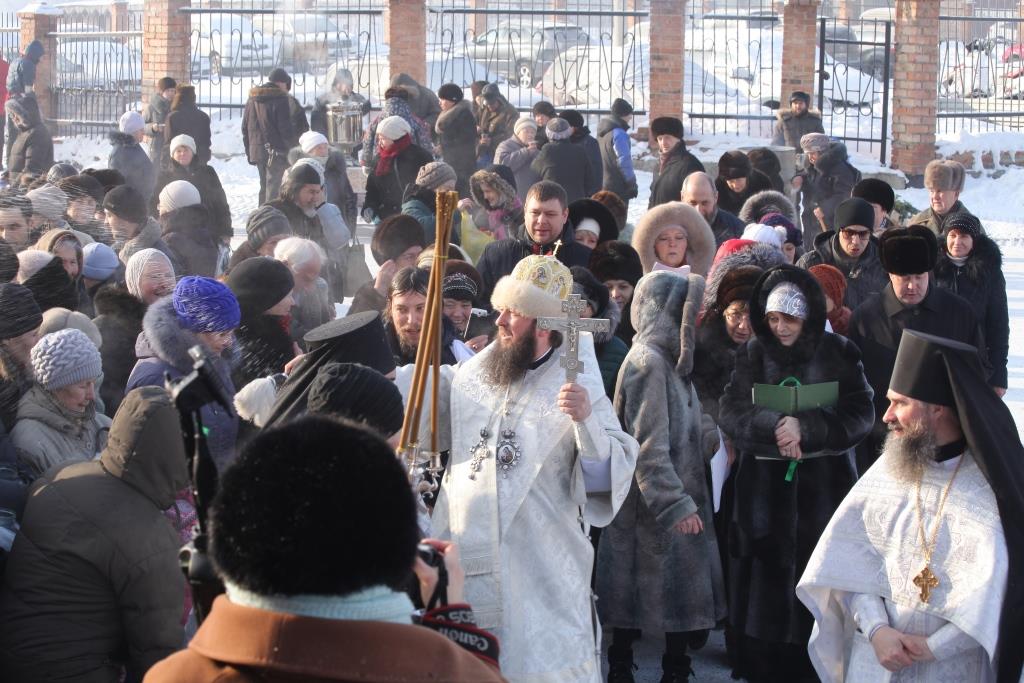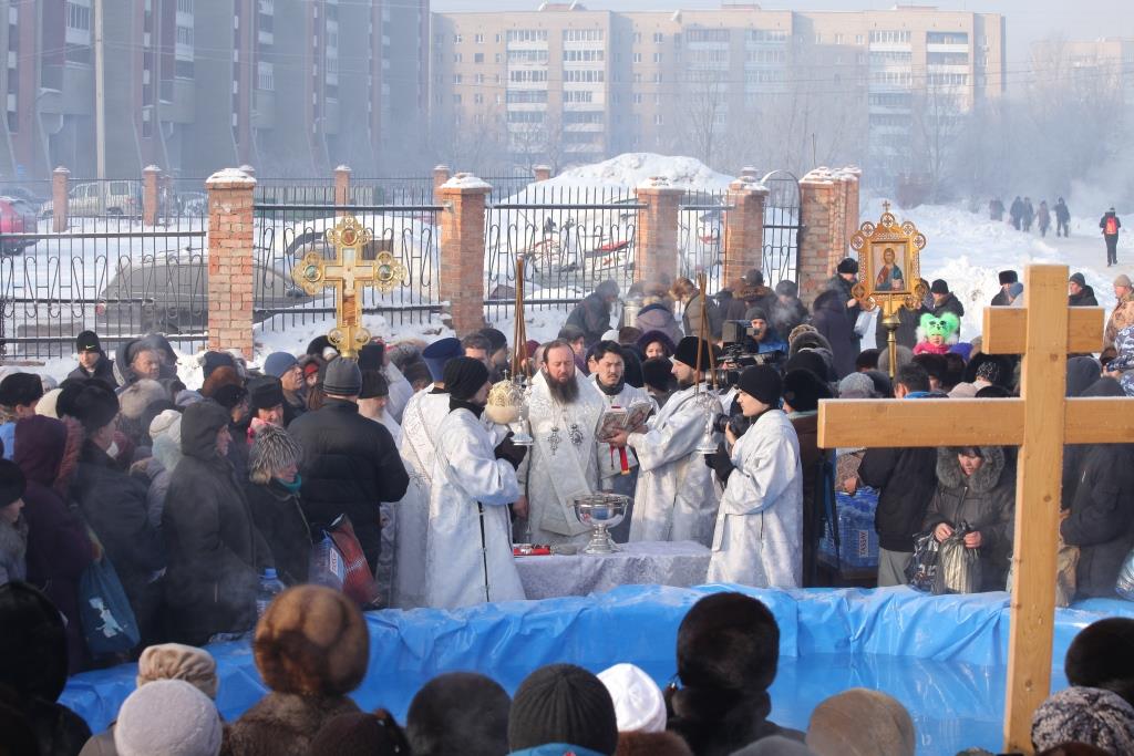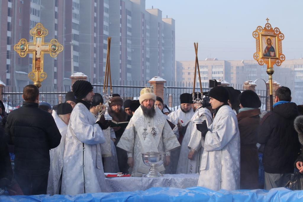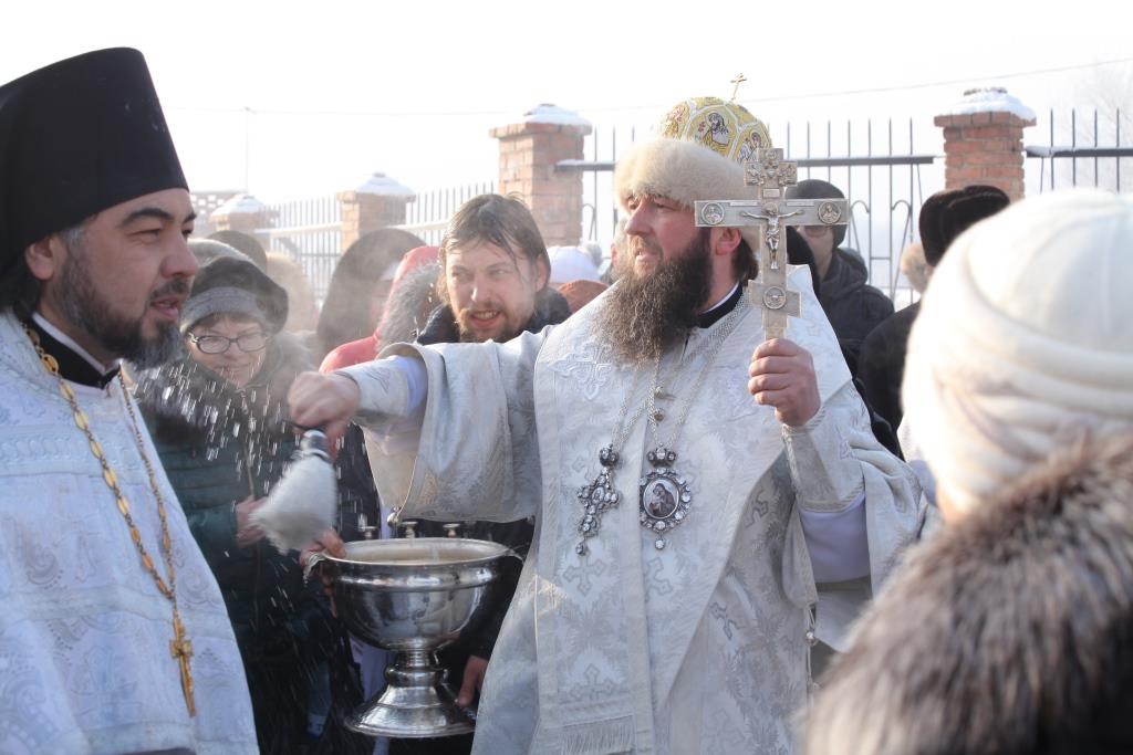 После заамвонной молитвы, при пении праздничных тропарей тропарей «Глас Господень на водах», прославляющих милость Божию к Своему творению, Архипастырь и священнослужители вышли из храма на соборную площадь, где в специально устроенной купели при большом стечении молящихся было совершено великое освящение воды. После освящения епископ Амфилохий окропил молящихся святой водой. По окончании Богослужения Архипастырь обратился к верующим со словами проповеди.