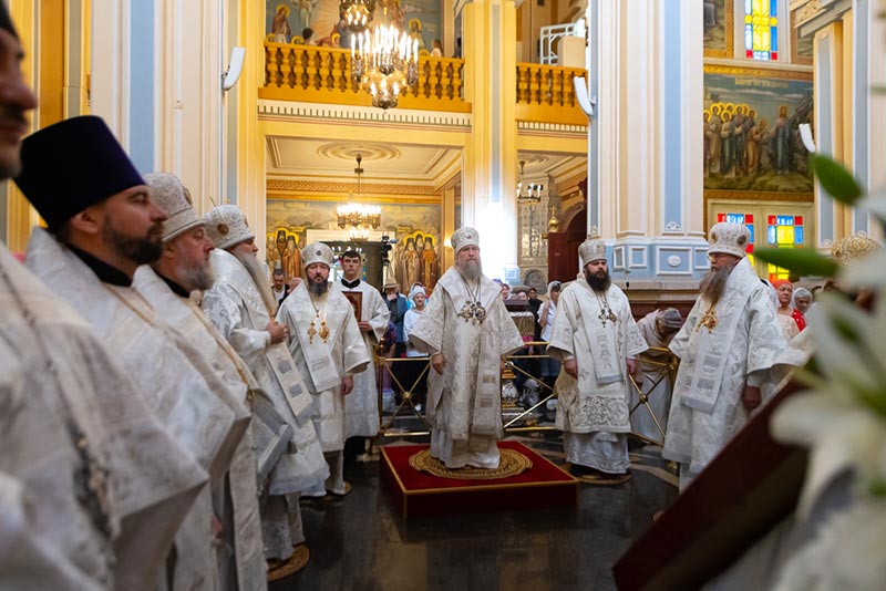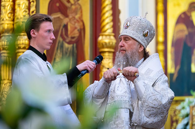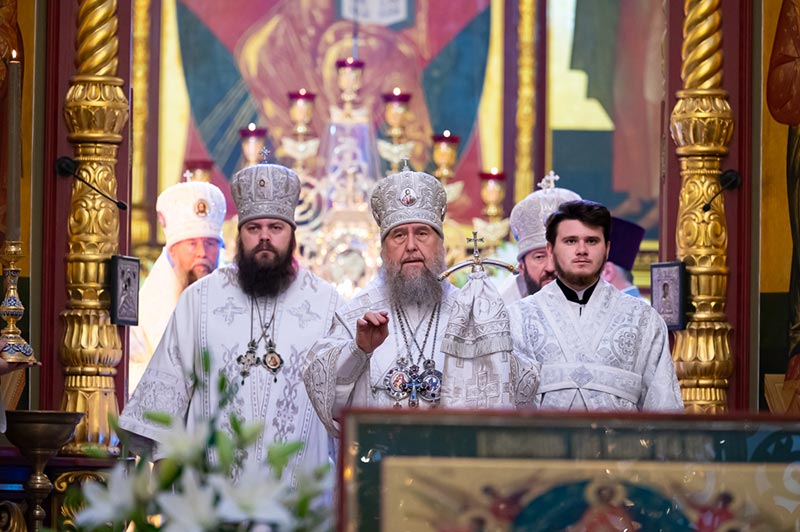 Предстоятель Православной Церкви Казахстана поздравил иерархов, духовенство, монашествующих и мирян с праздником, и произнес проповедь о значении евангельского события Вознесения Спасителя на Небо для спасения человеческого рода.