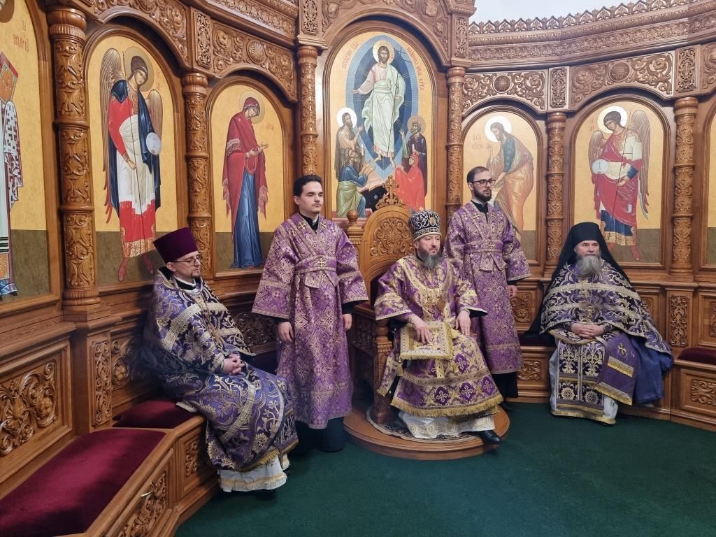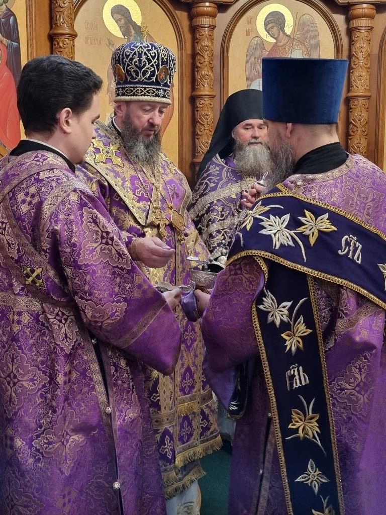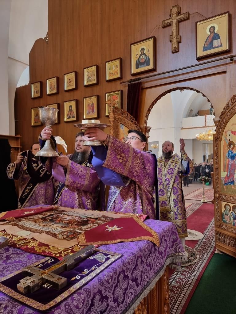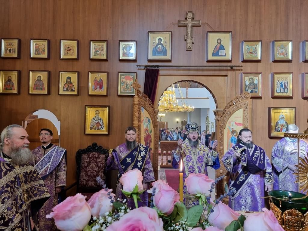 Владыке архиепископу сослужили: ключарь кафедрального собора иеромонах Никодим (Авдеев), иерей Константин Дьяков; секретарь епархии диакон Илия Кван, протодиаконы Георгий Засыпкин и Андрей Дудник. Песнопения Божественной Литургии исполнял хор кафедрального собора (регент Н. Романцова).