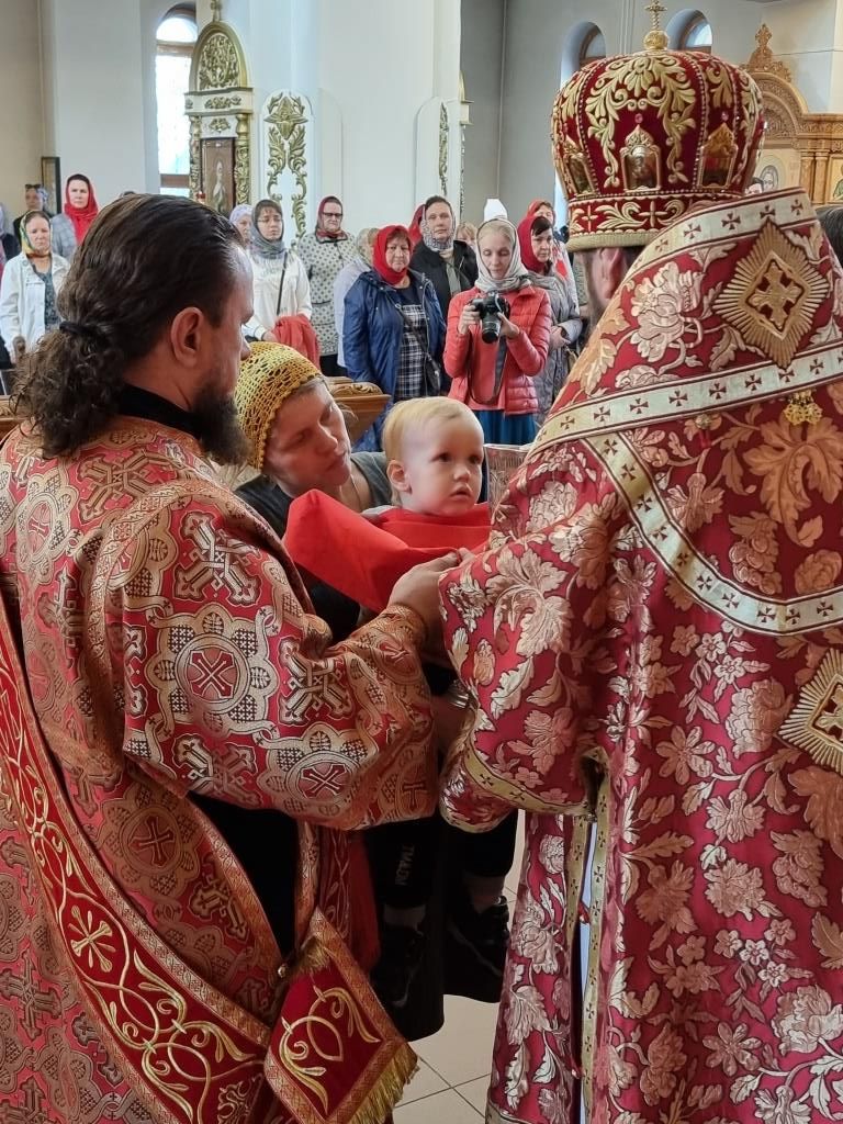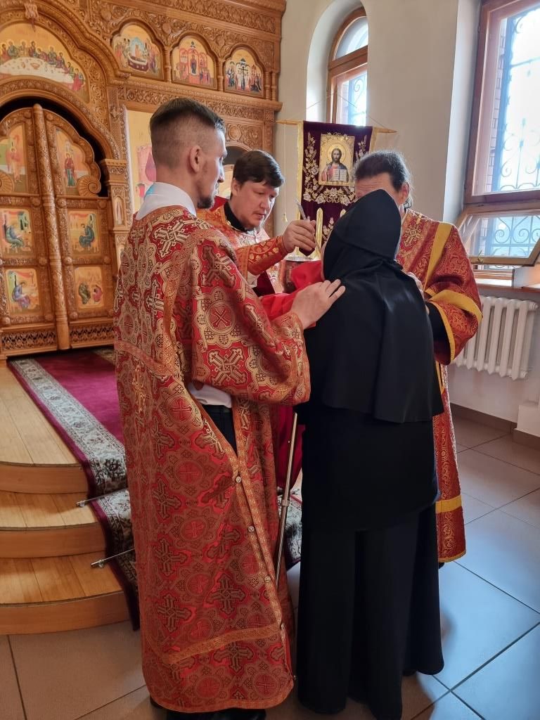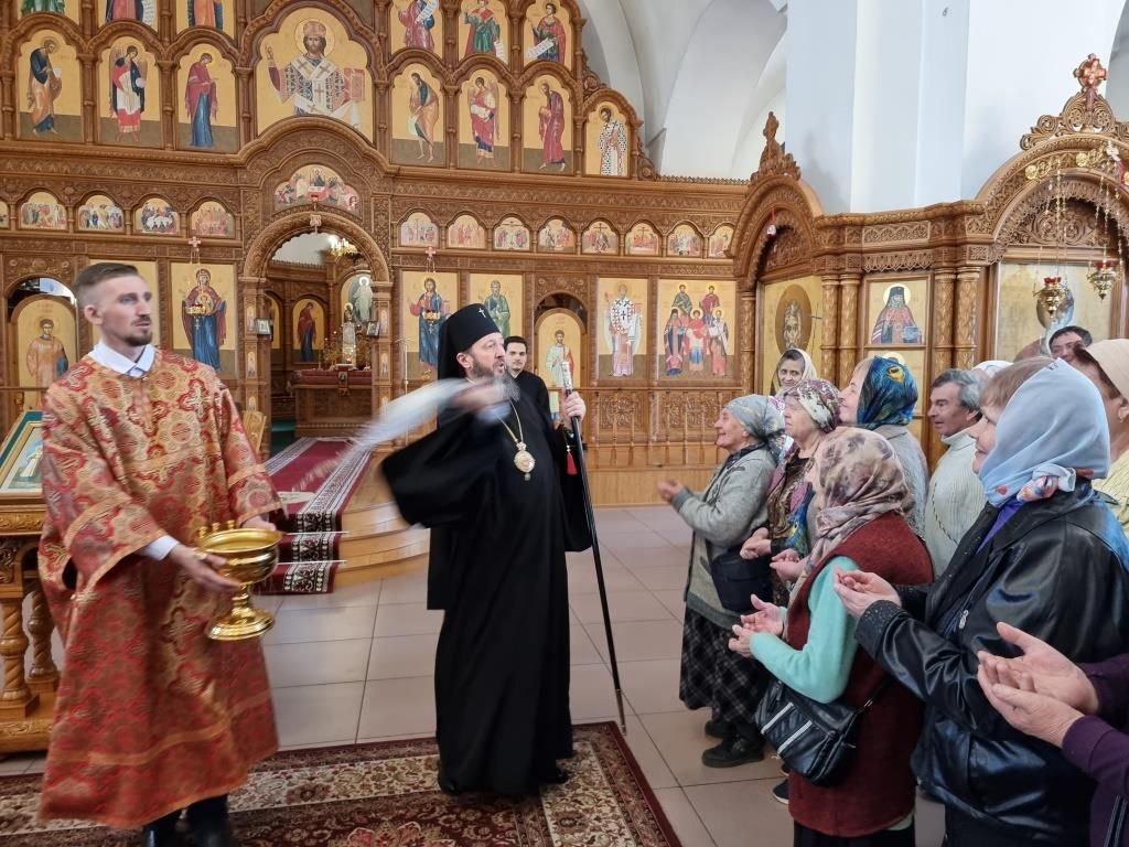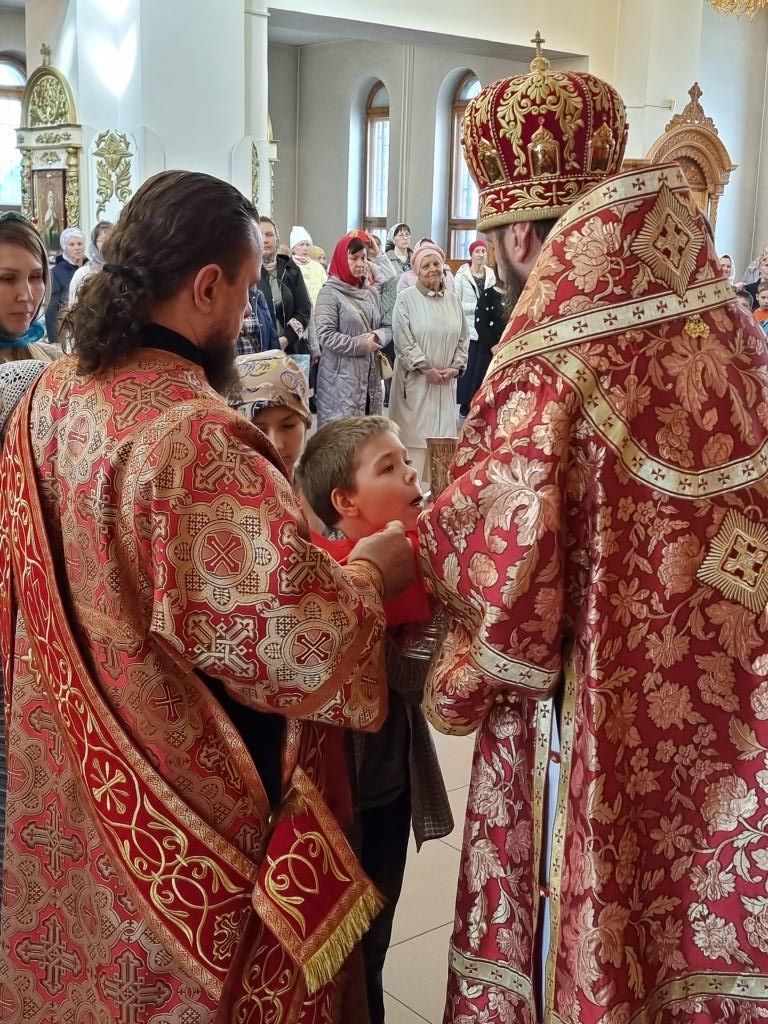 За богослужением молились сотрудники епархиального управления, преподаватели и воспитанники Центральной воскресной школы, прихожане кафедрального собора и насельники Свято-Троицкого мужского монастыря города Усть-Каменогорска. Перед причастием мирян проповедовал иерей Алексий Клепиков.