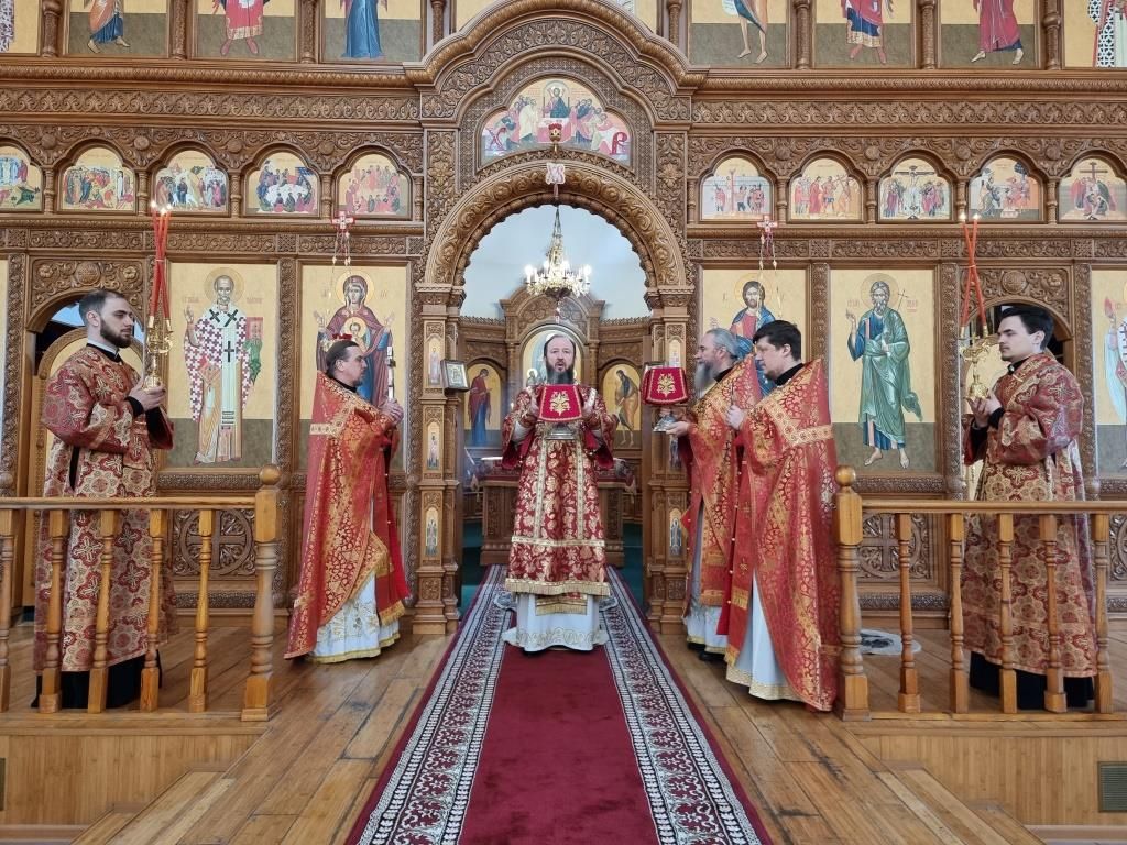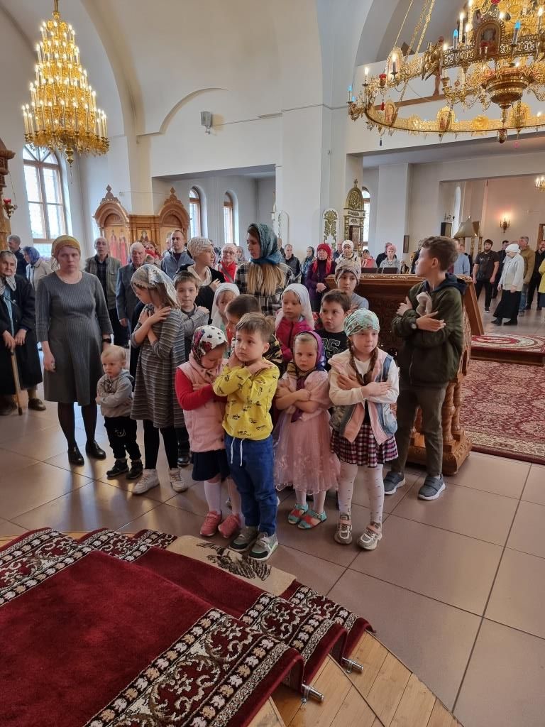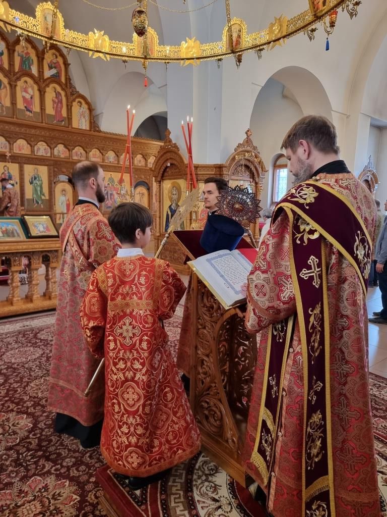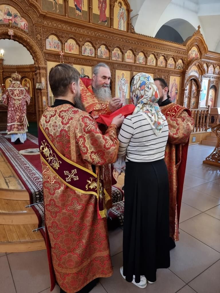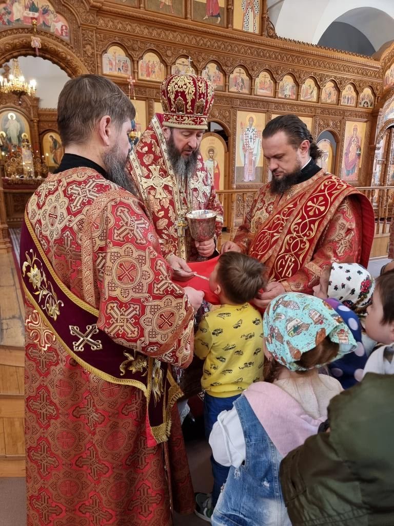 За богослужением молились сотрудники епархиального управления, преподаватели и воспитанники Центральной воскресной школы, прихожане кафедрального собора и насельники Свято-Троицкого мужского монастыря города Усть-Каменогорска. Перед причастием мирян проповедовал иерей Алексий Клепиков.