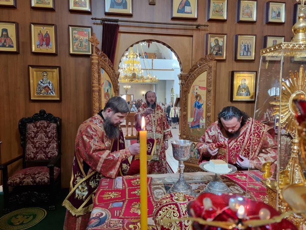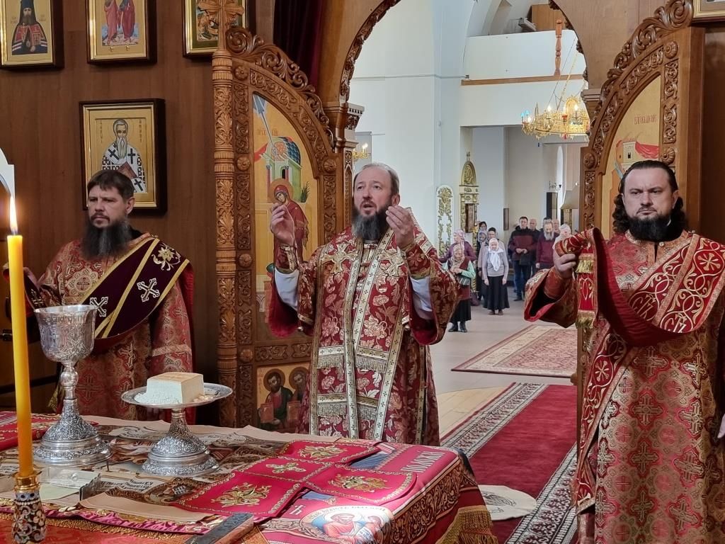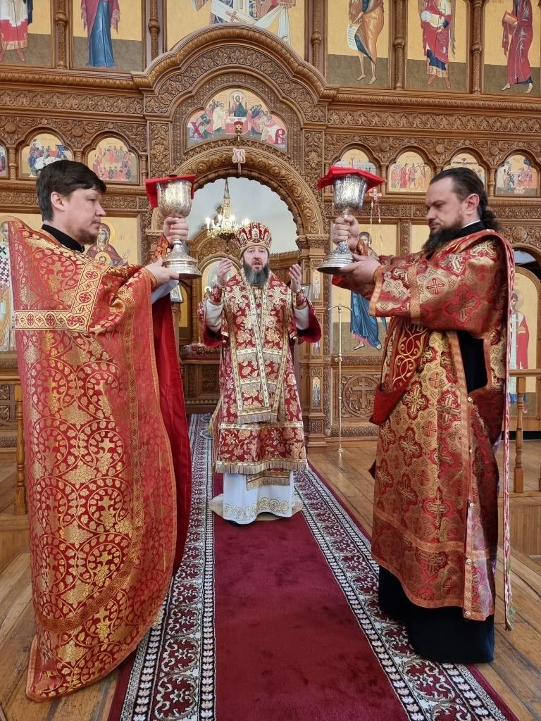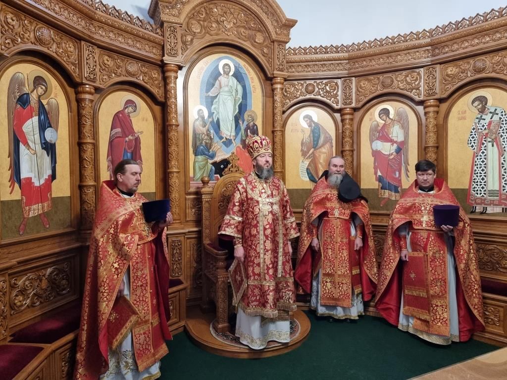 Владыке архиепископу сослужили: ключарь кафедрального собора иеромонах Никодим (Авдеев), иерей Алексий Клепиков, иерей Роман Подрезов; протодиаконы Георгий Засыпкин и Андрей Дудник. Песнопения Божественной Литургии исполнял хор кафедрального собора (регент Н. Романцова).