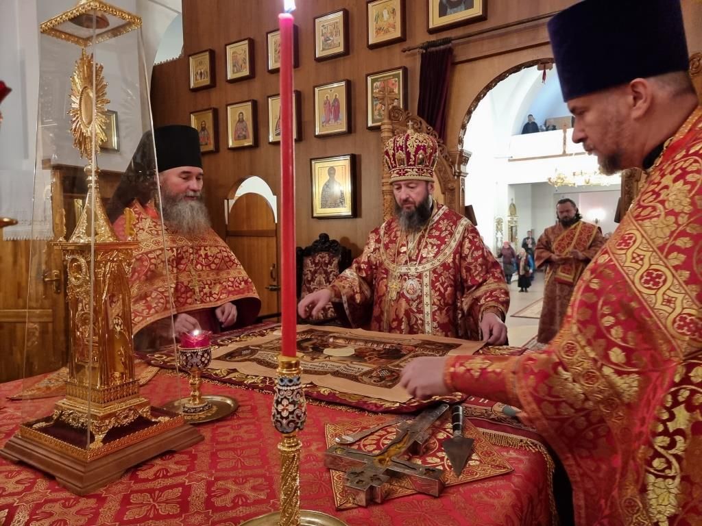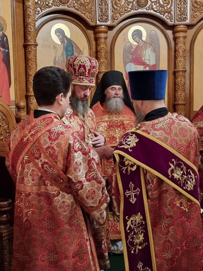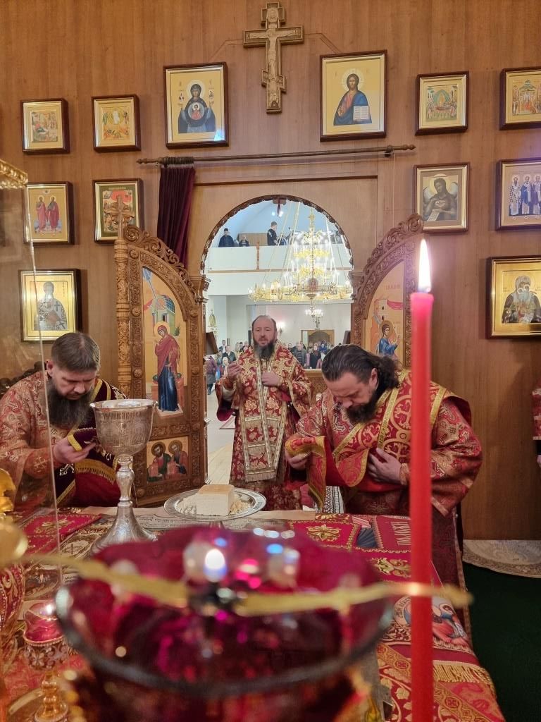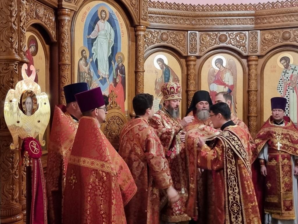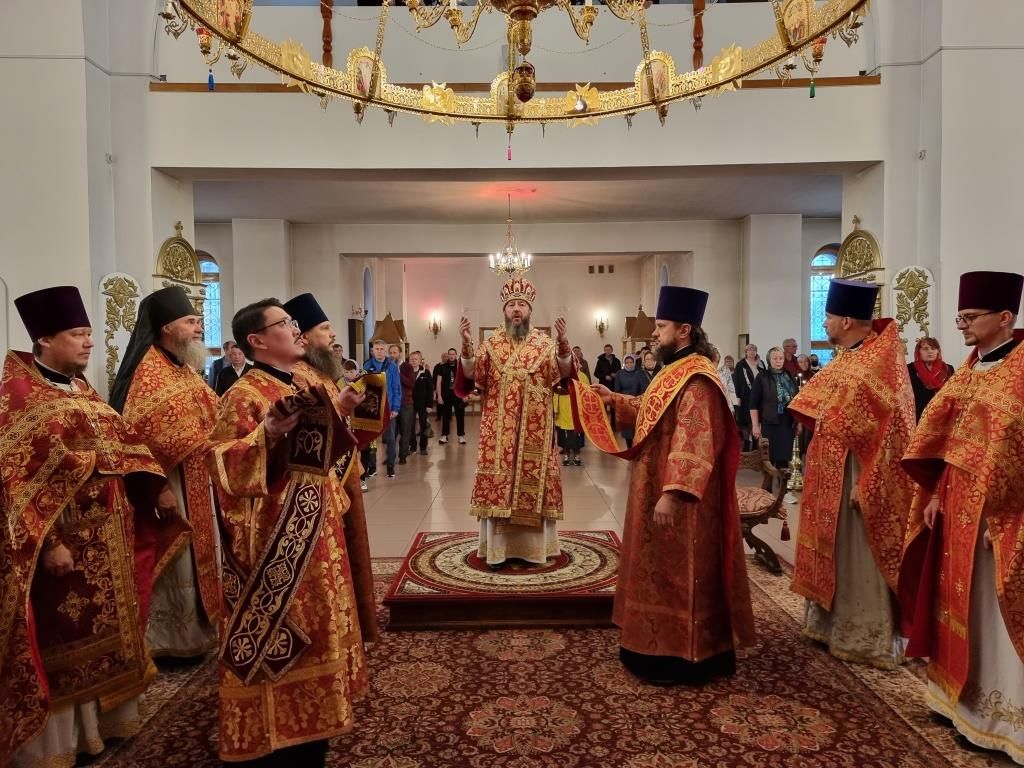 Его Высокопреосвященству сослужили: ключарь кафедрального собора иеромонах Никодим (Авдеев), клирики собора иерей Виталий Адаменков, иерей Роман Подрезов и иерей Константин Дьяков; секретарь епархии диакон Илия Кван, протодиакон Георгий Засыпкин и протодиакон Андрей Дудник.