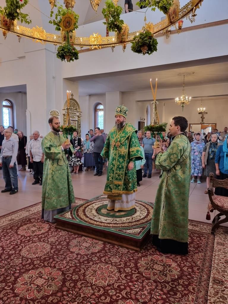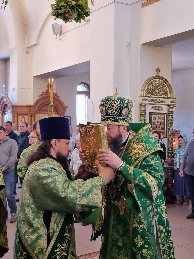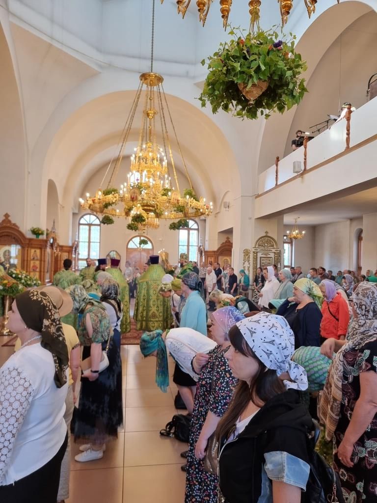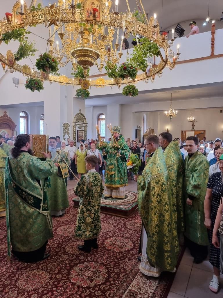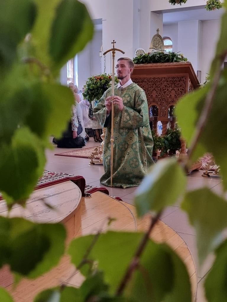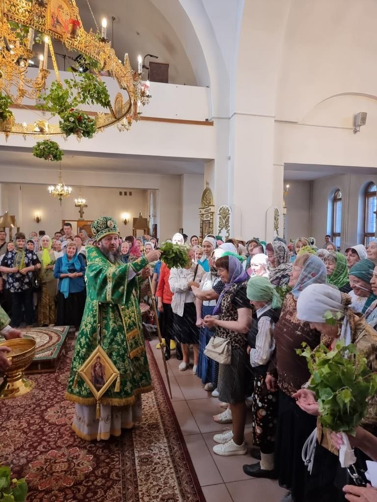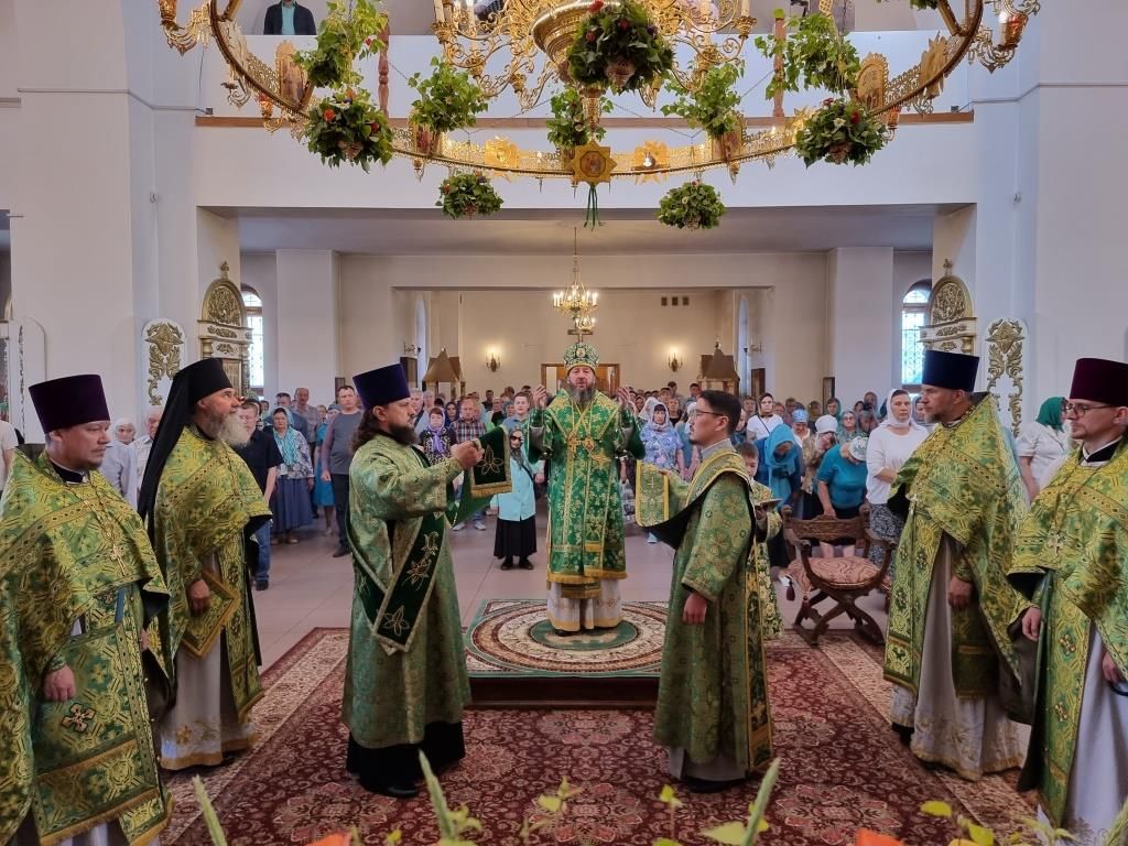 Песнопения праздника Пятидесятницы и Божественной Литургии исполнял хор кафедрального собора под управлением регента Н. Романцовой. За богослужением молились прихожане кафедрального собора и насельники Свято-Троицкого монастыря, сотрудники епархиального управления.