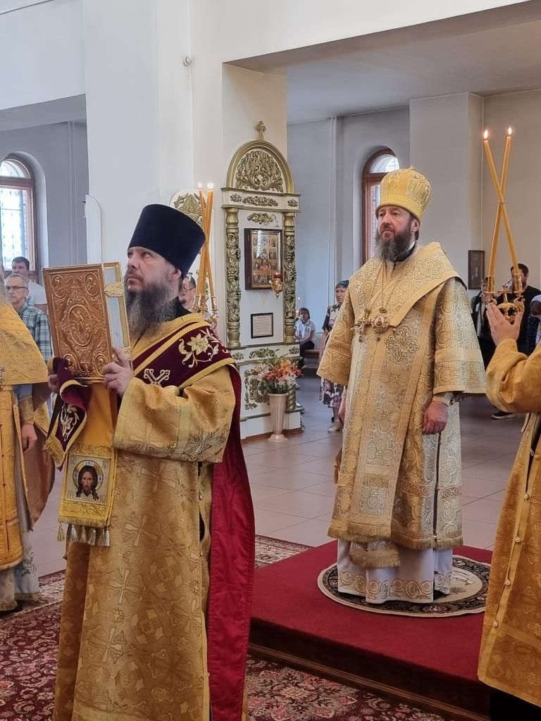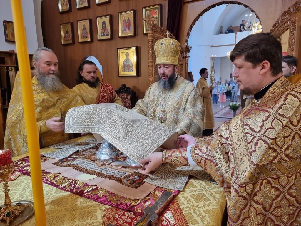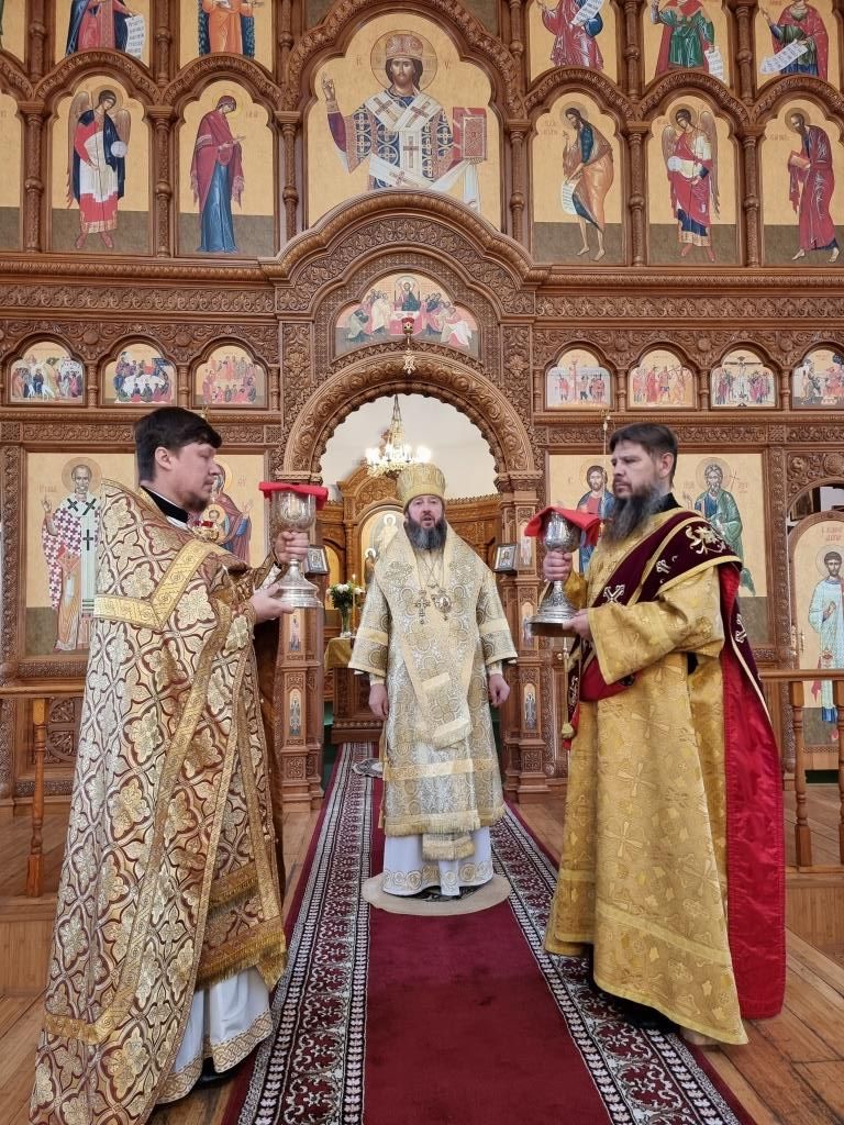 Владыке архиепископу сослужили: ключарь кафедрального собора иеромонах Никодим (Авдеев), клирики собора иерей Роман Подрезов и иерей Константин Дьяков, секретарь епархии диакон Илия Кван, протодиакон Георгий Засыпкин, протодиакон Андрей Дудник. Песнопения Божественной Литургии исполнял хор кафедрального собора под управлением регента Н. Романцовой.