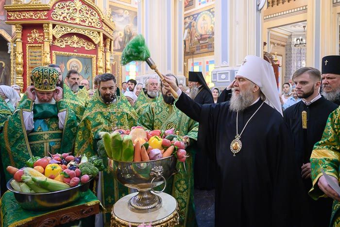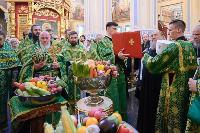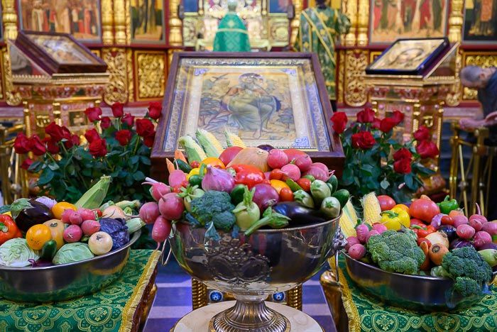 По старинной традиции, связанной с Ильиным днем, владыка митрополит совершил чин освящения плодов нового урожая – прочитал молитву «О приносящих начатки овощей»: «Владыко Господи Боже наш, Твоя от Твоих приносити Тебе по предложению комуждо повелевый…» и окропил овощи и фрукты святой водой.