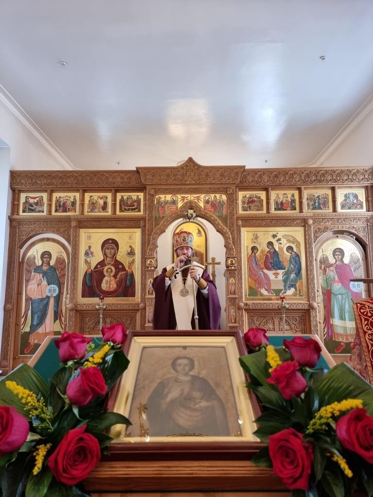 После славления Высокопреосвященнейший архиепископ Амфилохий поздравил всех собравшихся с праздником святого великомученика Пантелеимона и обратился к прихожанам со словами Архипастырского поучения.