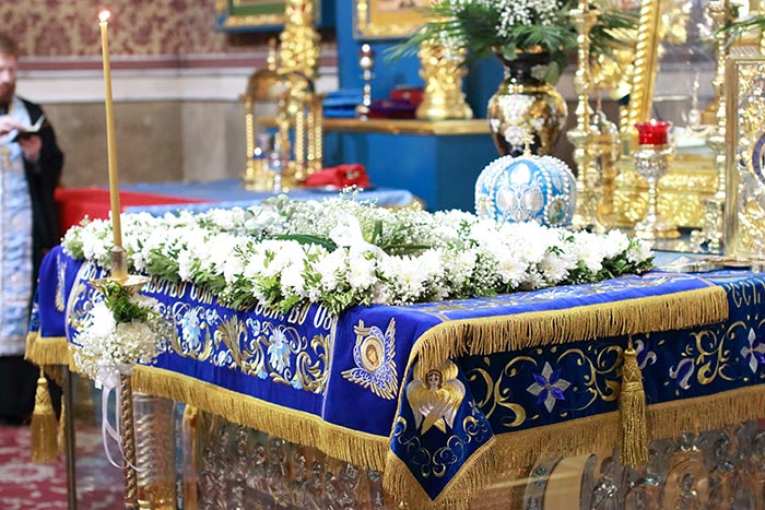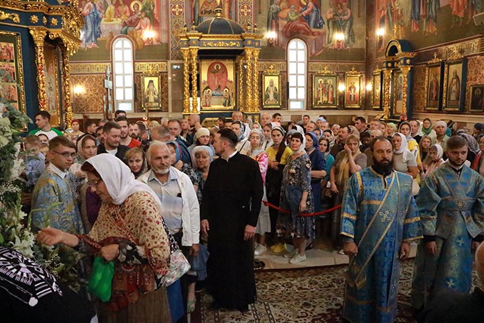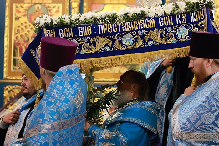 На утрене, во время пения тропаря праздника «В Рождестве девство сохранила еси», из алтаря на середину храма была изнесена плащаница с изображением Успения Божией Матери и положена на украшенную цветами и виноградной лозой гробницу.