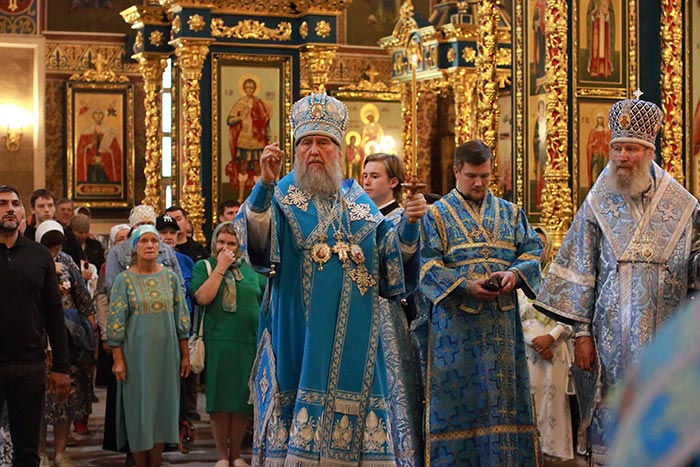27 августа 2023 года. Астана. В канун праздника Успения Пресвятой Богородицы митрополит Астанайский и Казахстанский Александр совершил всенощное бдение в Успенском кафедральном соборе.
