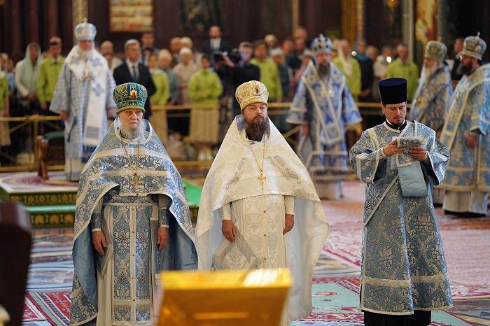Его Святейшеству сослужили: митрополит Астанайский и Казахстанский Александр, Глава Православной Церкви Казахстана; митрополит Воскресенский Дионисий, управляющий делами Московской Патриархии, первый викарий Патриарха Московского и всея Руси по городу Москве; архиепископ Усть-Каменогорский и Семипалатинский Амфилохий; епископ Видновский Тихон; епископ Серпуховской Роман; епископ Зарайский Константин; протопресвитер Владимир Диваков, секретарь Патриарха Московского и всея Руси по городу Москве; протоиерей Михаил Рязанцев, ключарь Храма Христа Спасителя; архимандрит Алексий (Туриков), личный секретарь Святейшего Патриарха Кирилла; архимандрит Феодосий (Курьянов), настоятель кафедрального собора Михаила Архангела города Уральска (Уральская епархия); архимандрит Дионисий (Козулев), благочинный Уральского церковного округа; протоиерей Павел Придатченко, клирик Ханты-Мансийской епархии; столичное духовенство.