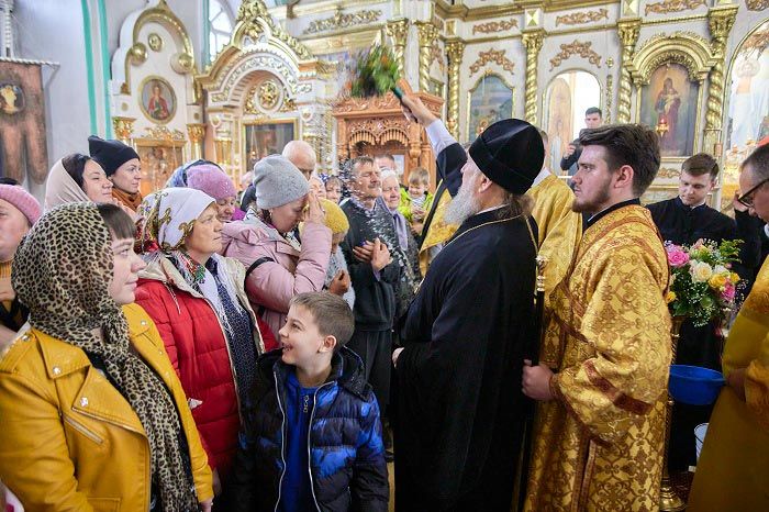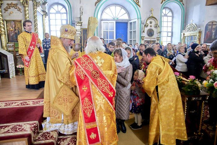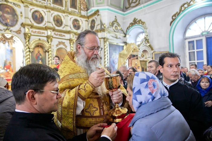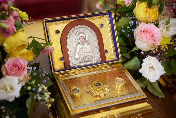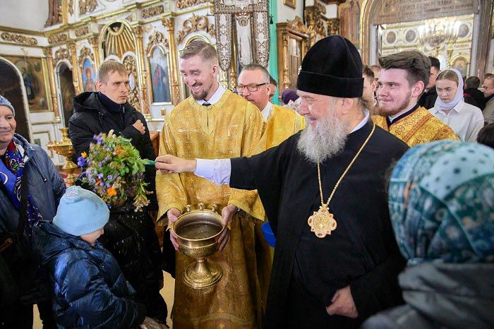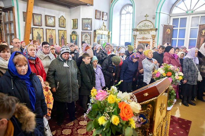 В завершение Литургии духовенство, хор и верующие пропели тропарь, кондак и величание небесному покровителю земли Рудного Алтая, и блаженной старице Матроне Московской перед ковчегом с ее честными мощами.