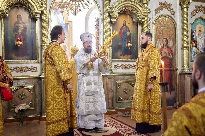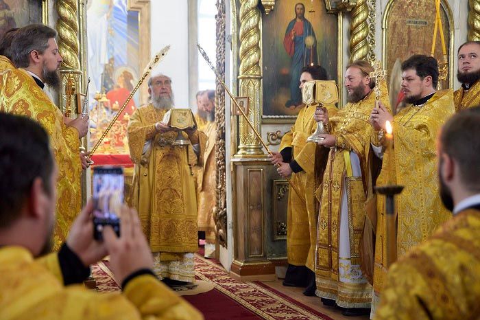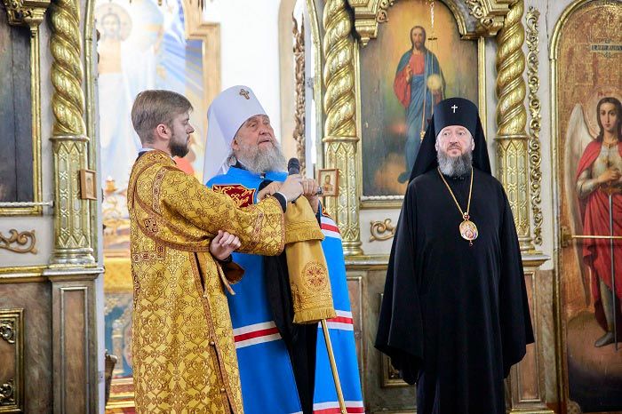 Главе Православной Церкви Казахстана сослужили: архиепископ Усть-Каменогорский и Семипалатинский Амфилохий, епископ Уральский и Атырауский Вианор; благочинный Семипалатинского церковного округа, ключарь Воскресенского кафедрального собора города Семипалатинска протоиерей Евгений Яганов, клирик Знаменско-Абалацкого Петро-Павловского женского монастыря города Семипалатинска иеромонах Агапит (Никонов), клирик Воскресного собора протоиерей Сергий Жарич, настоятель Покровского собора иеромонах Силуан (Магилев), протодиакон Владимир Сыровацкий, протодиакон Александр Мокий, протодиакон Андрей Дудник, секретарь Усть-Каменогорской епархии диакон Илия Кван, диакон Иоанн Чуркин, диакон Богдан Бойко, диакон Сергий Слесарчук и духовенство Восточного Казахстана.