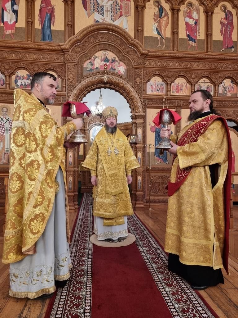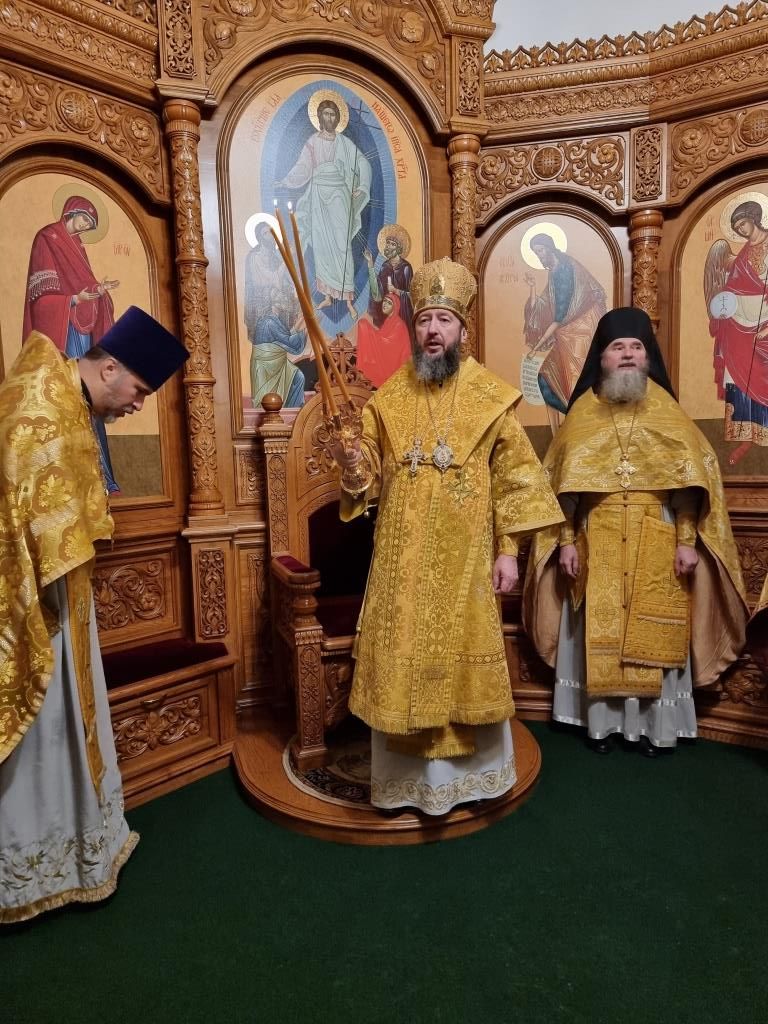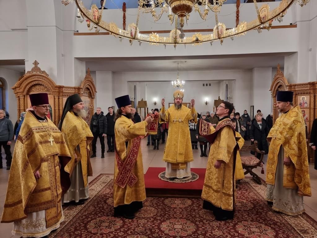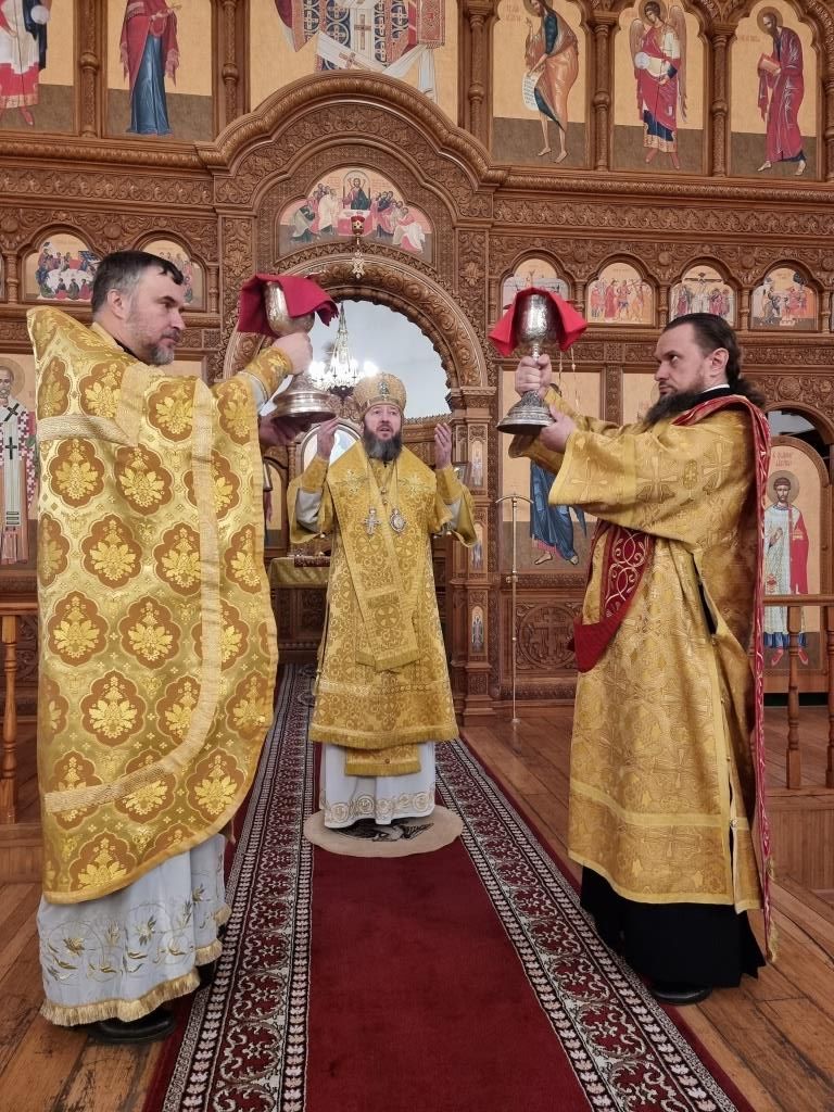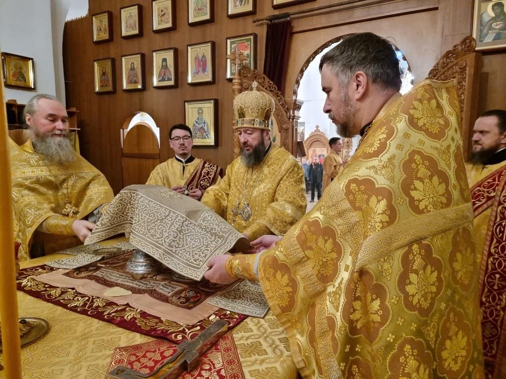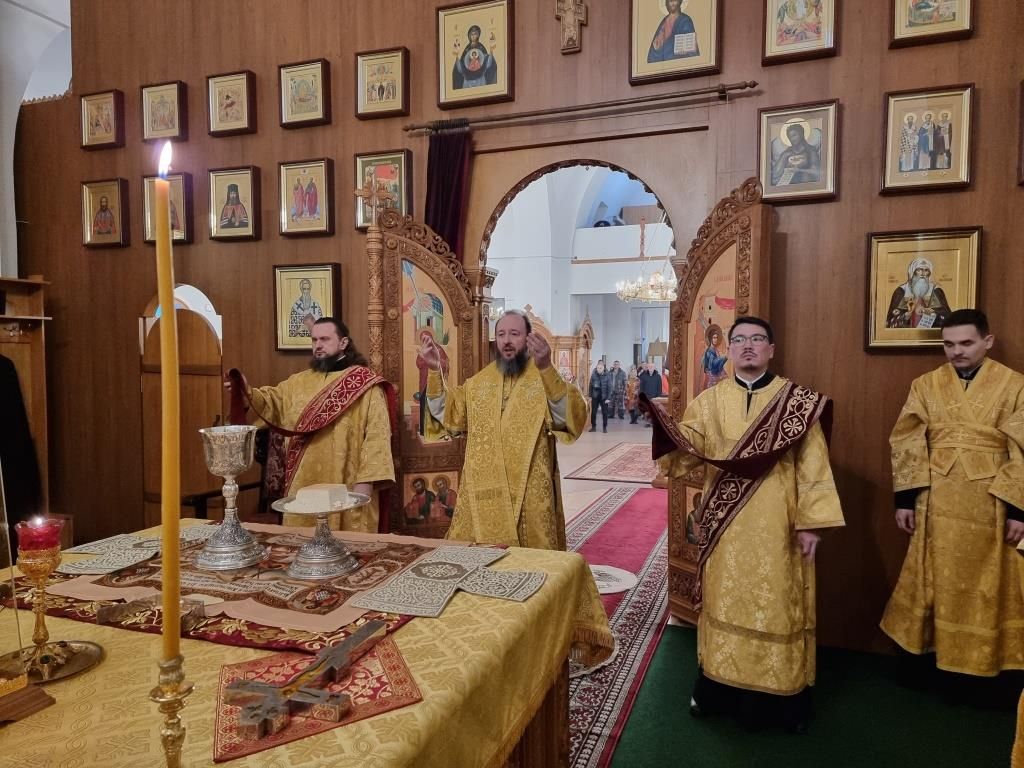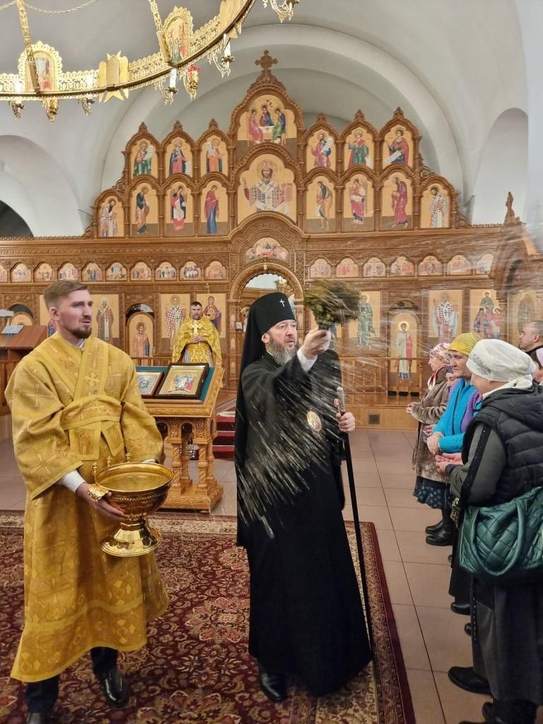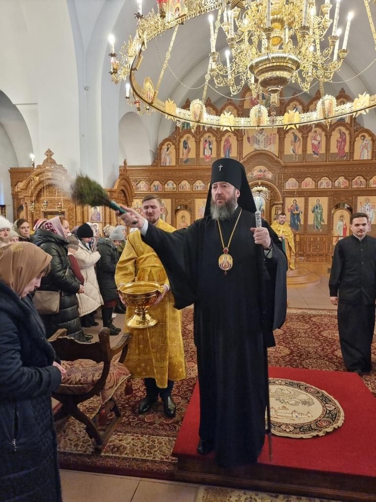 Архипастырю сослужили: ключарь кафедрального собора иеромонах Никодим (Авдеев), клирики собора иерей Виталий Адаменков и иерей Константин Дьяков, секретарь епархии диакон Илия Кван, протодиакон Андрей Дудник.