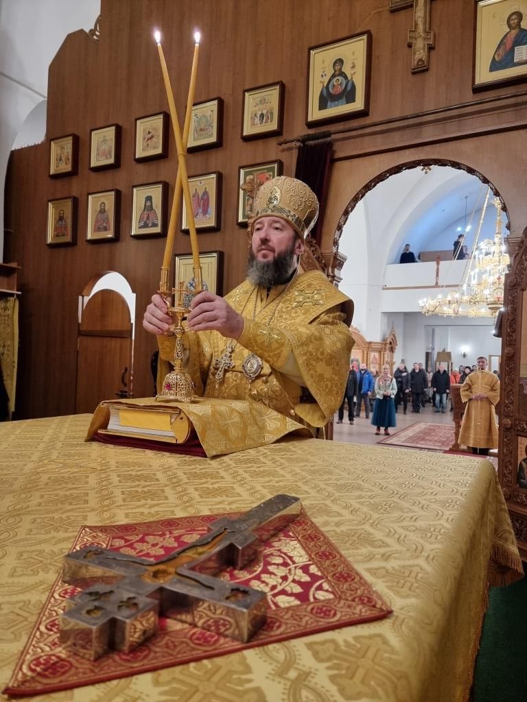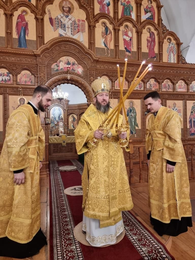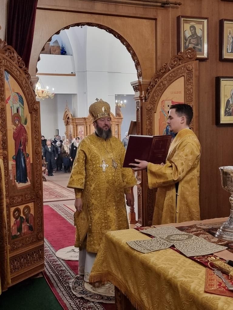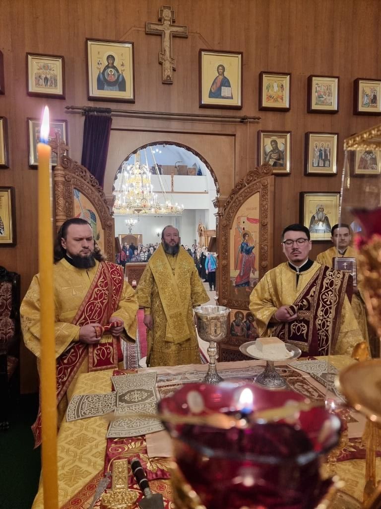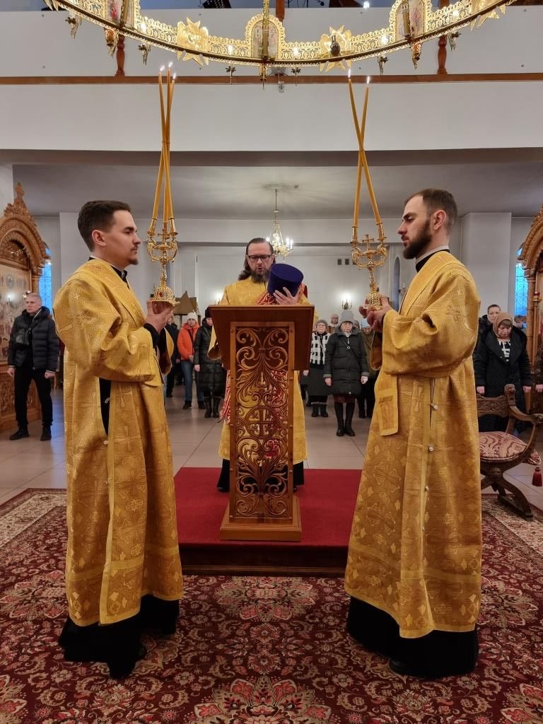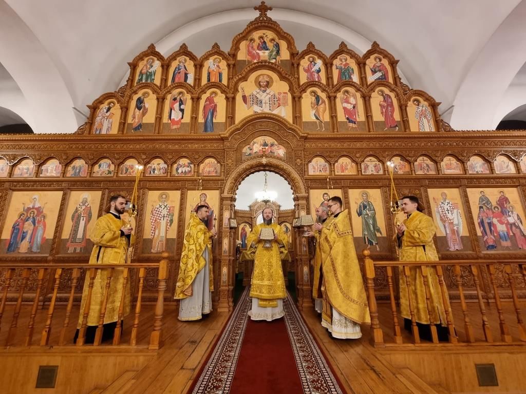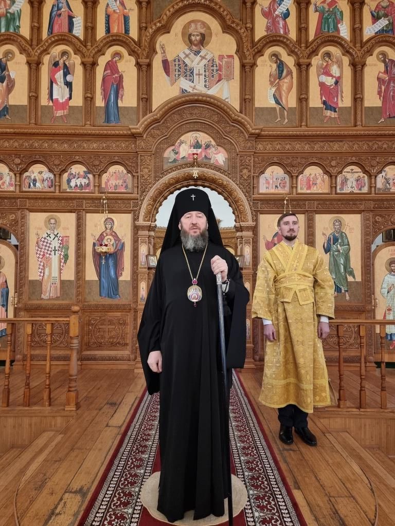Архипастырю сослужили: ключарь кафедрального собора иеромонах Никодим (Авдеев), клирики собора иерей Виталий Адаменков и иерей Константин Дьяков, секретарь епархии диакон Илия Кван, протодиакон Андрей Дудник.